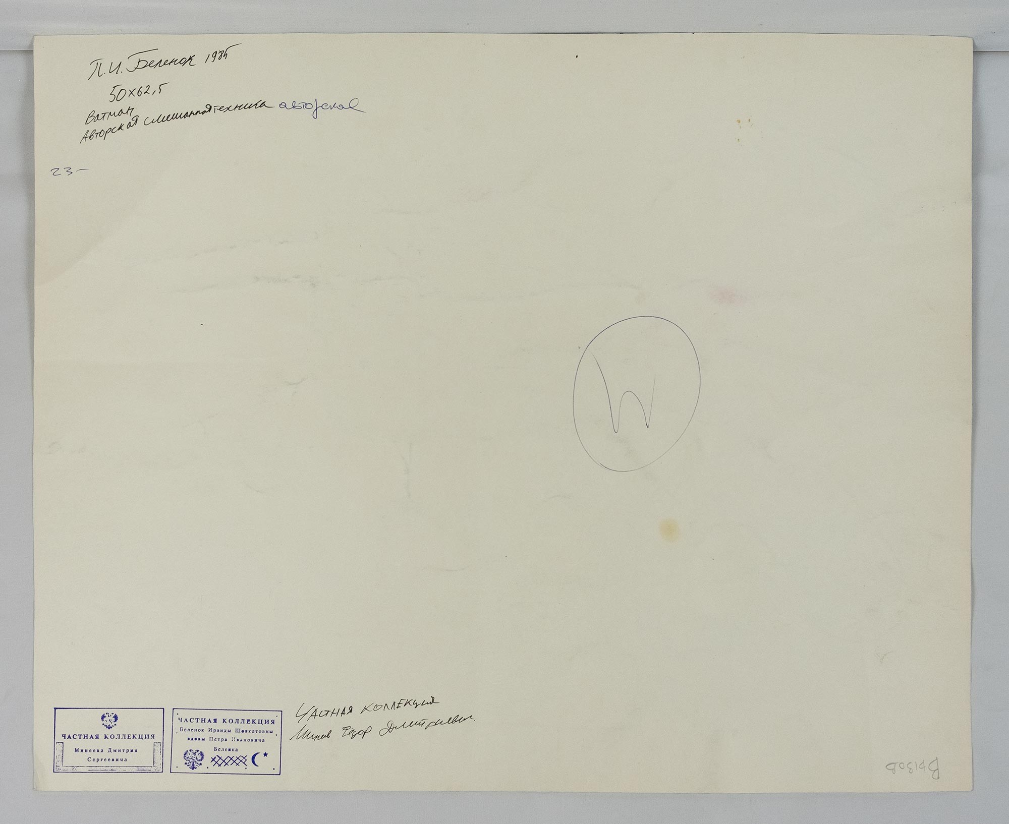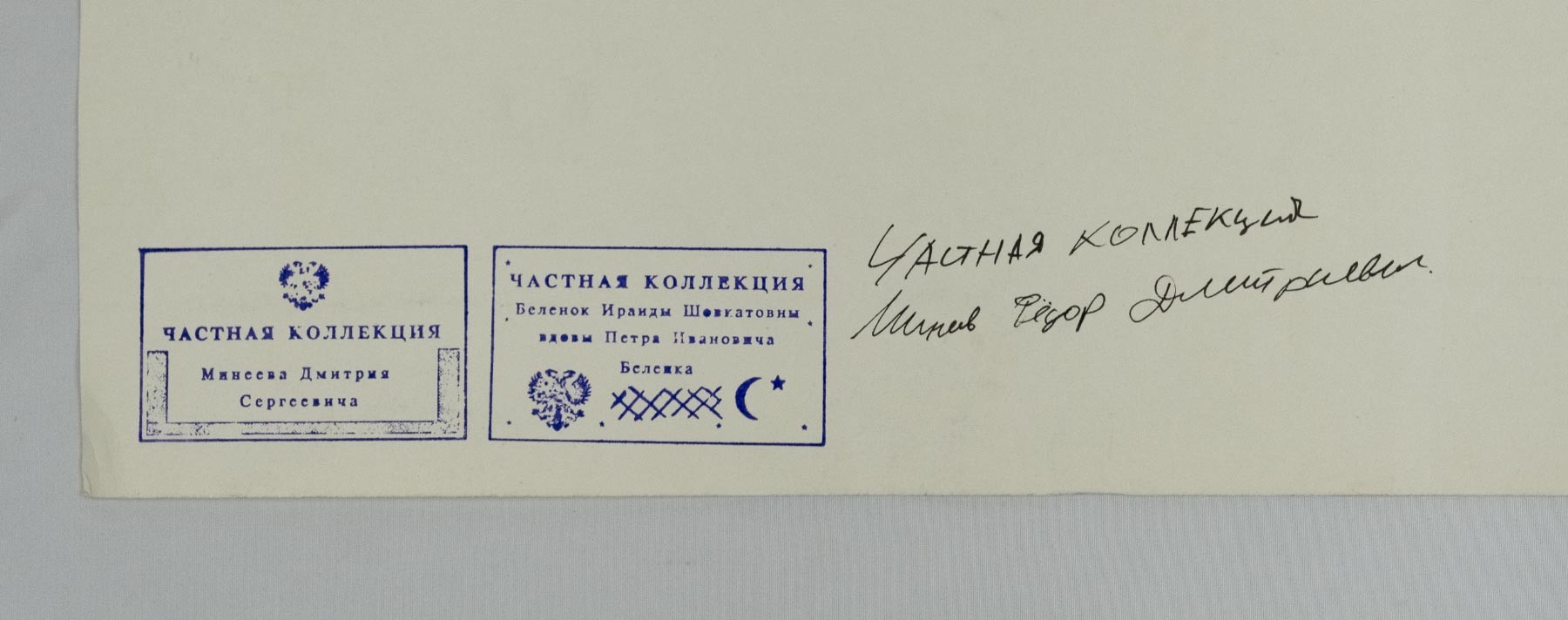 На обороте: автор, год, название, штампы коллекций наследников П. И. Беленка