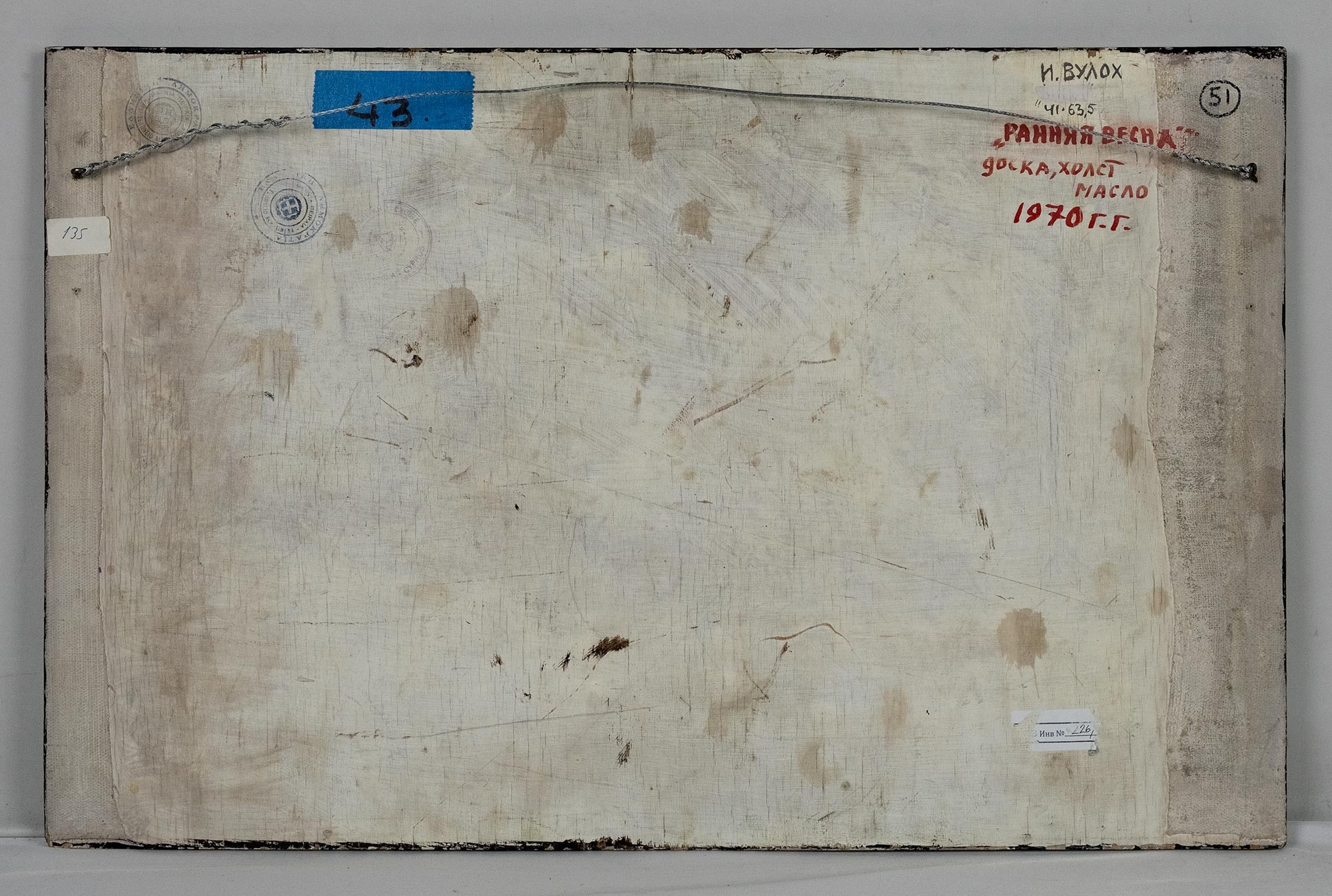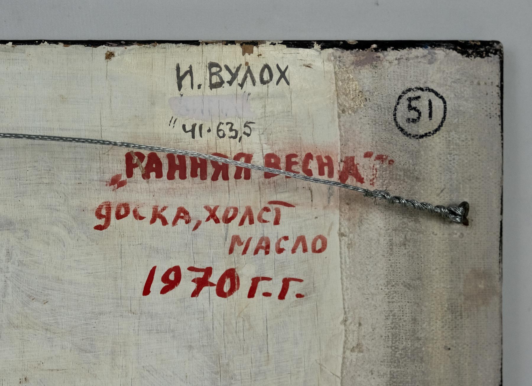 На обороте подпись, название и дата: И. ВУЛОХ / 41 • 63,5 / «РАНЯЯ ВЕСНА» / доска, холст, масло / 1970 г.г.