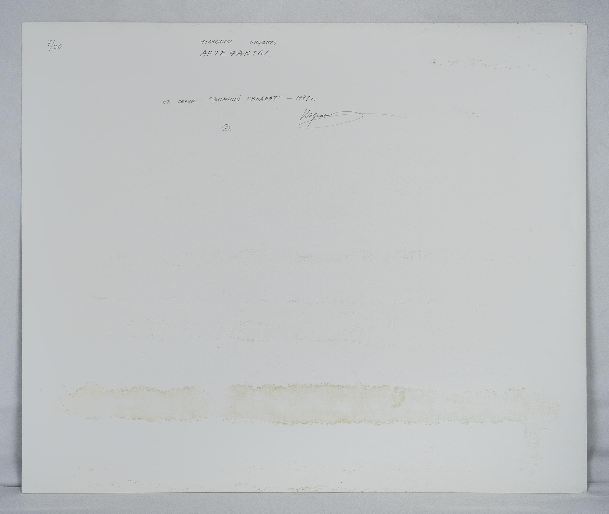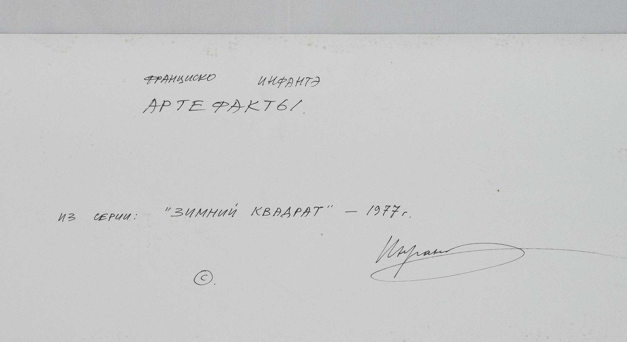 На обороте авторская надпись и подпись: Франциско Инфантэ / «АРТЕФАКТЫ» / из серии: «ЗИМНИЙ КВАДРАТ» — 1977 г. / © Инфан… (подпись)