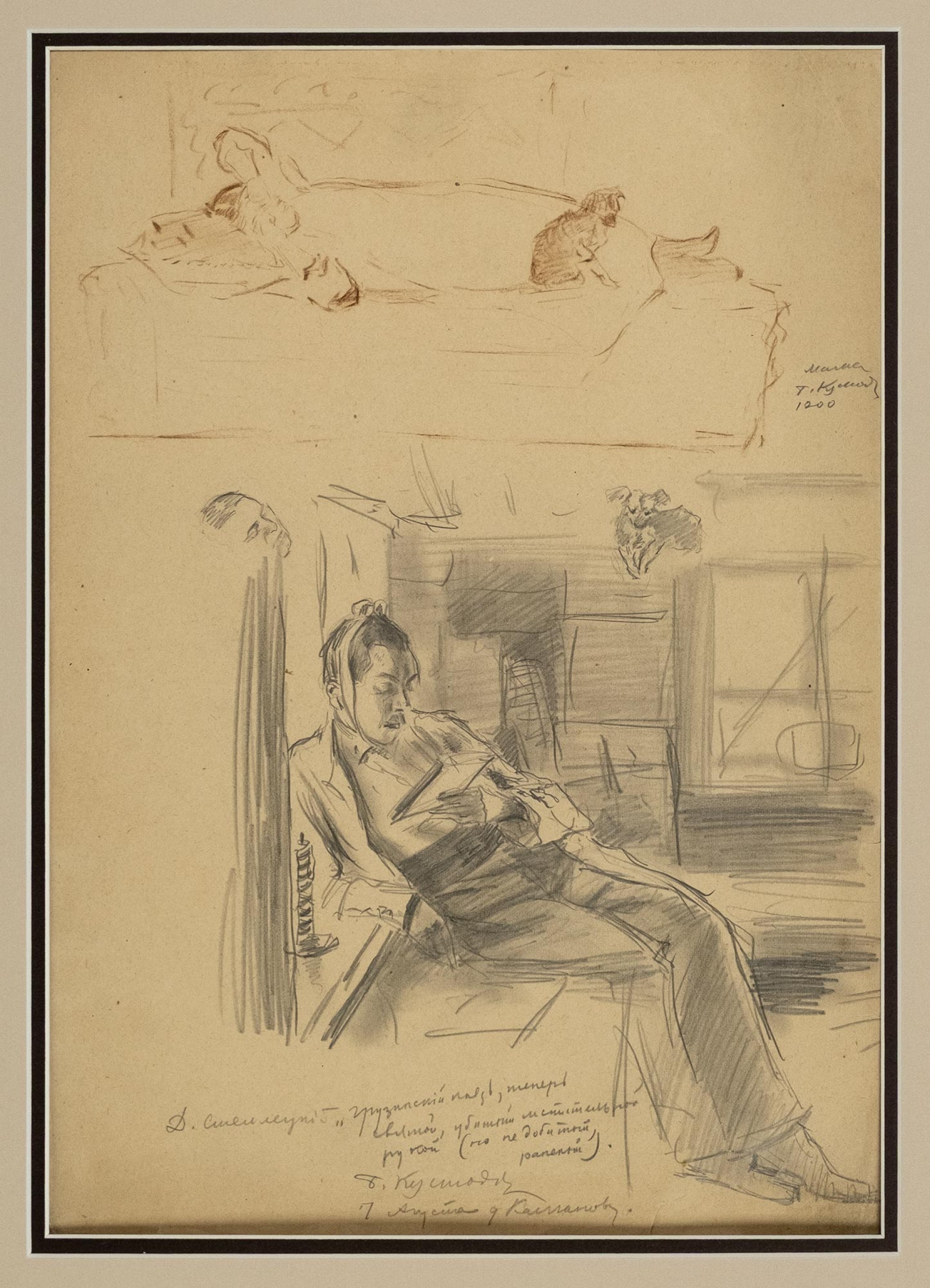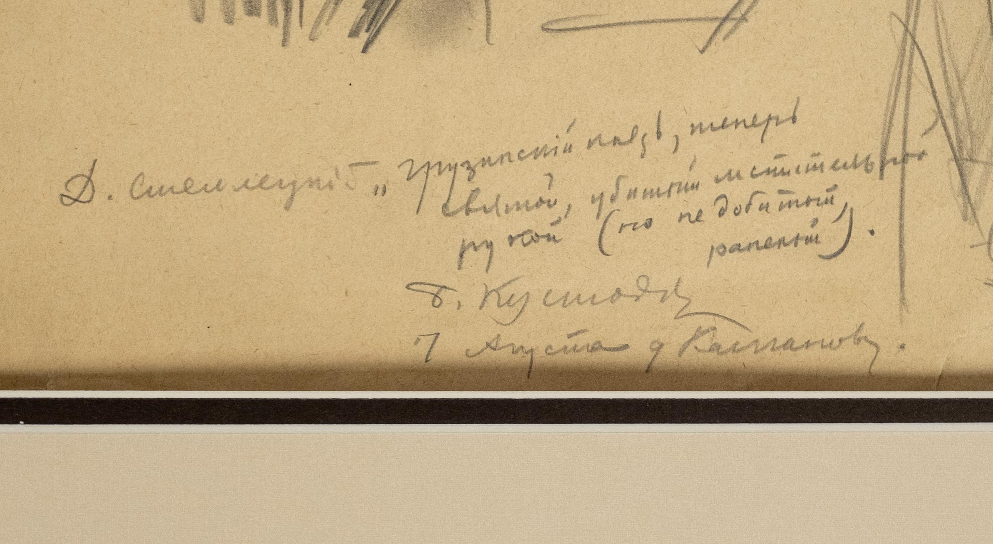Внизу надпись и подпись: Д. Стеллецкий «Грузинский князь, теперь святой, убитый мстительной рукой (но не добитый, раненный). / Б. Кустодиев / 7 Августа д. Калганово.