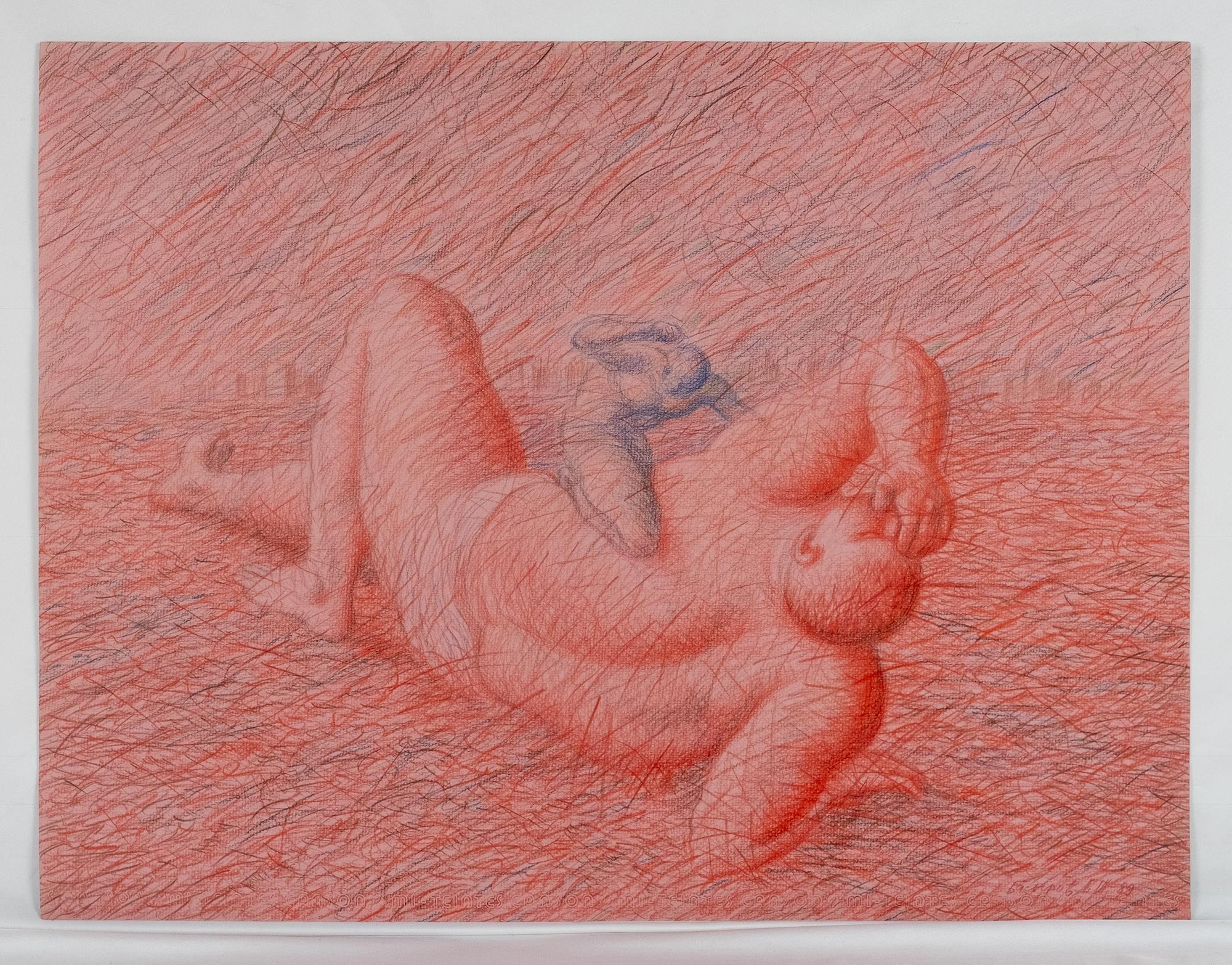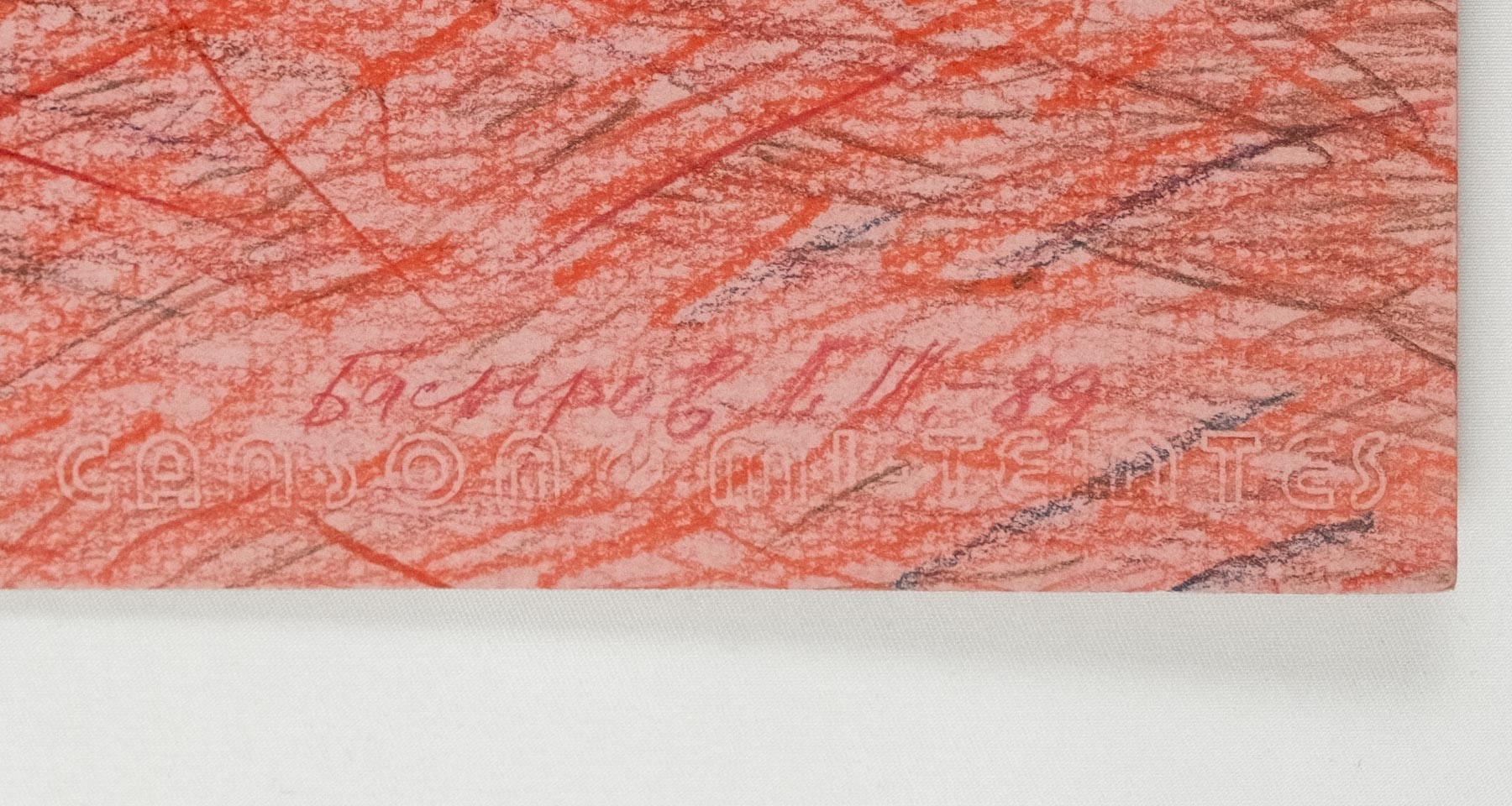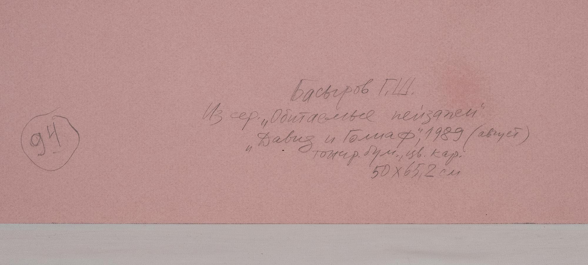 На обороте подпись и название карандашом: Басыров Г. Ш. / Из сер. «Обитаемые пейзажи» / «Давид и Голиаф», 1989 (август) / тонир. бум., цв. кар. / 50 × 62,5 см / (94)