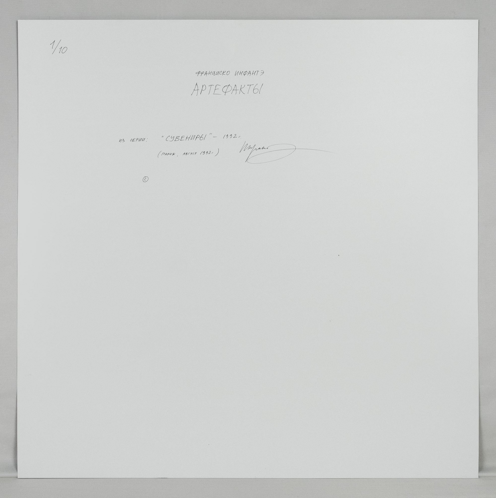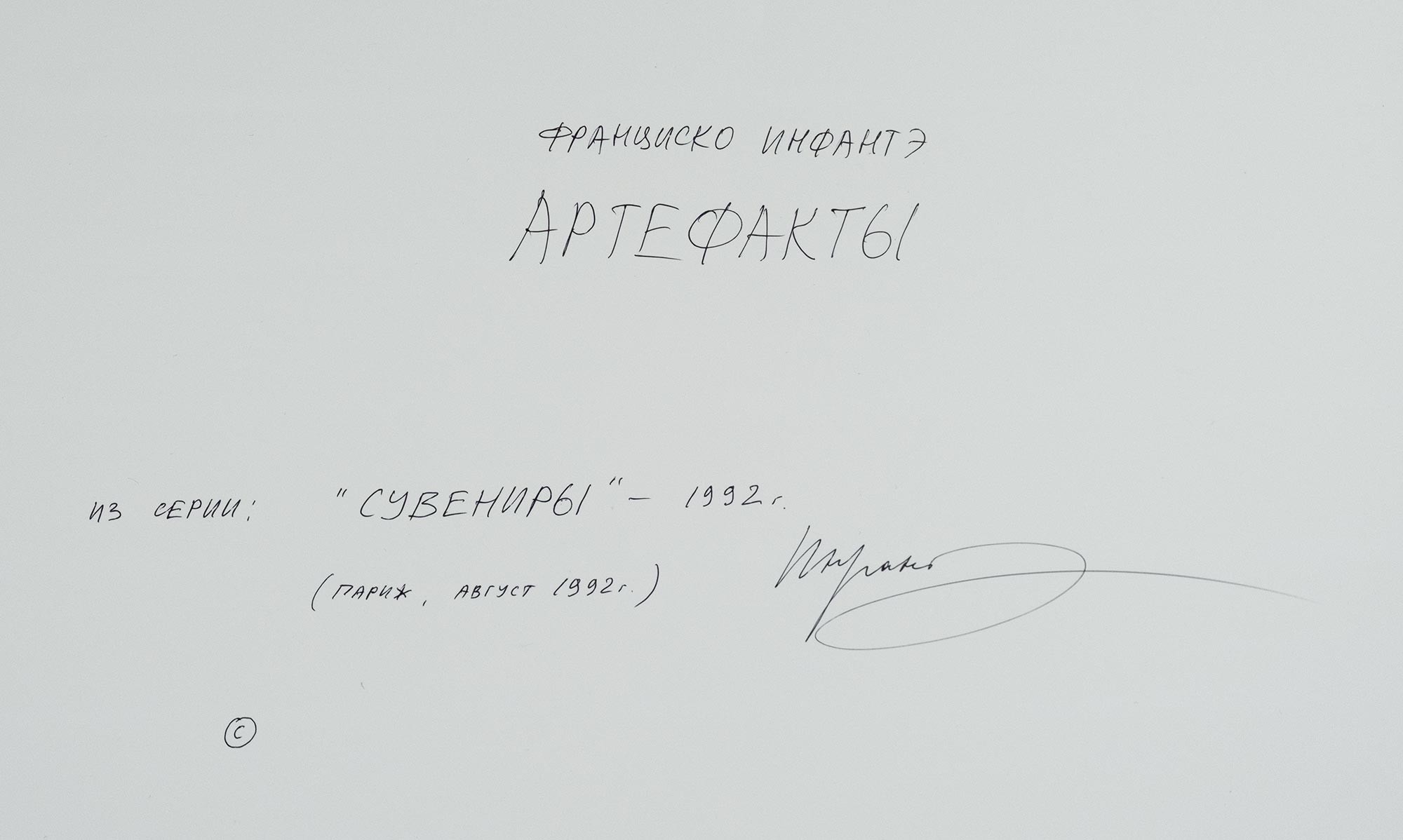 На обороте тираж, авторская надпись и подпись: 1/10 / Франциско Инфантэ / АРТЕФАКТЫ / из серии: «СУВЕНИРЫ» — 1992 г. / (Париж, август 1992 г.) / (подпись Инфантэ) / ©