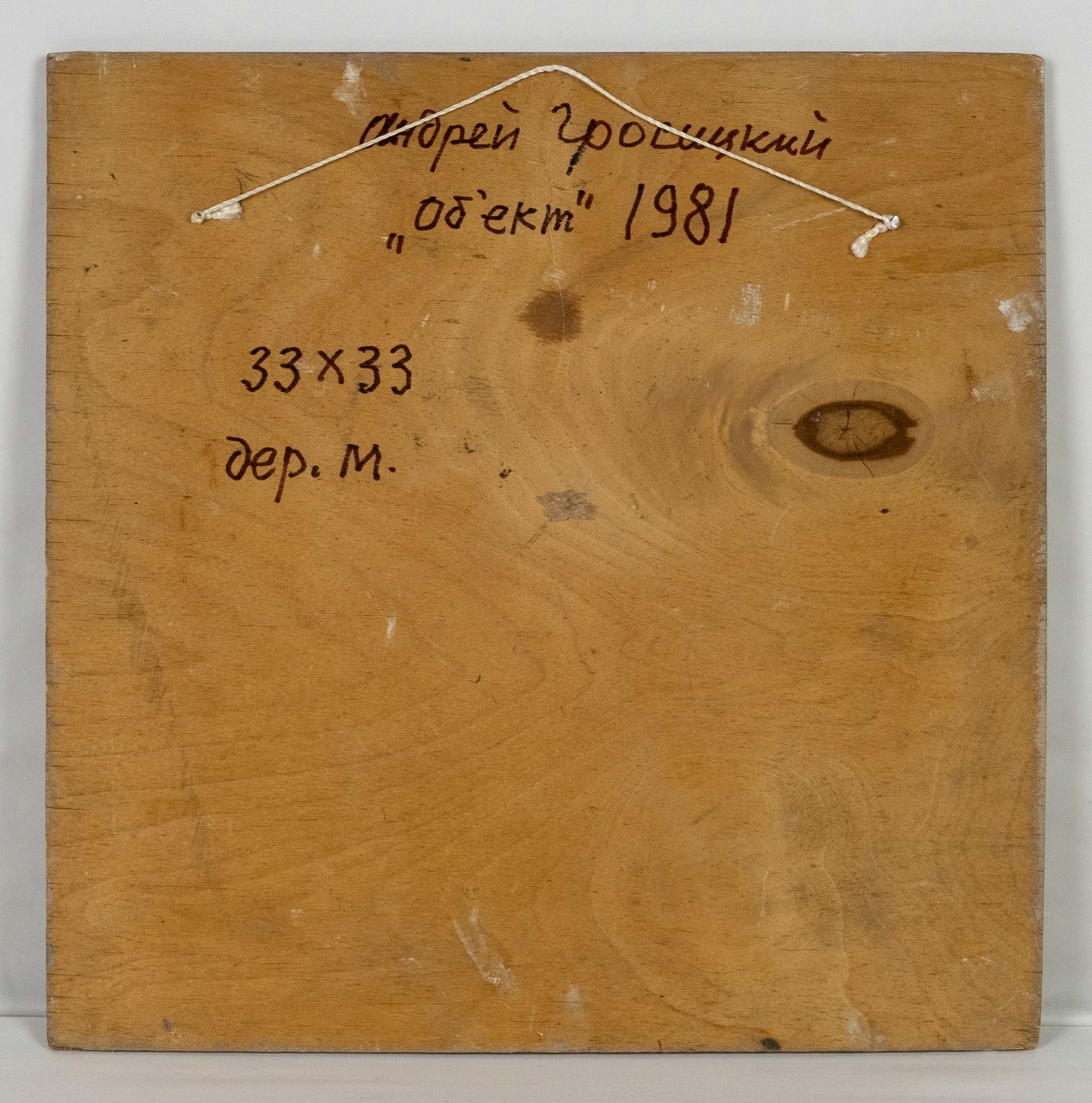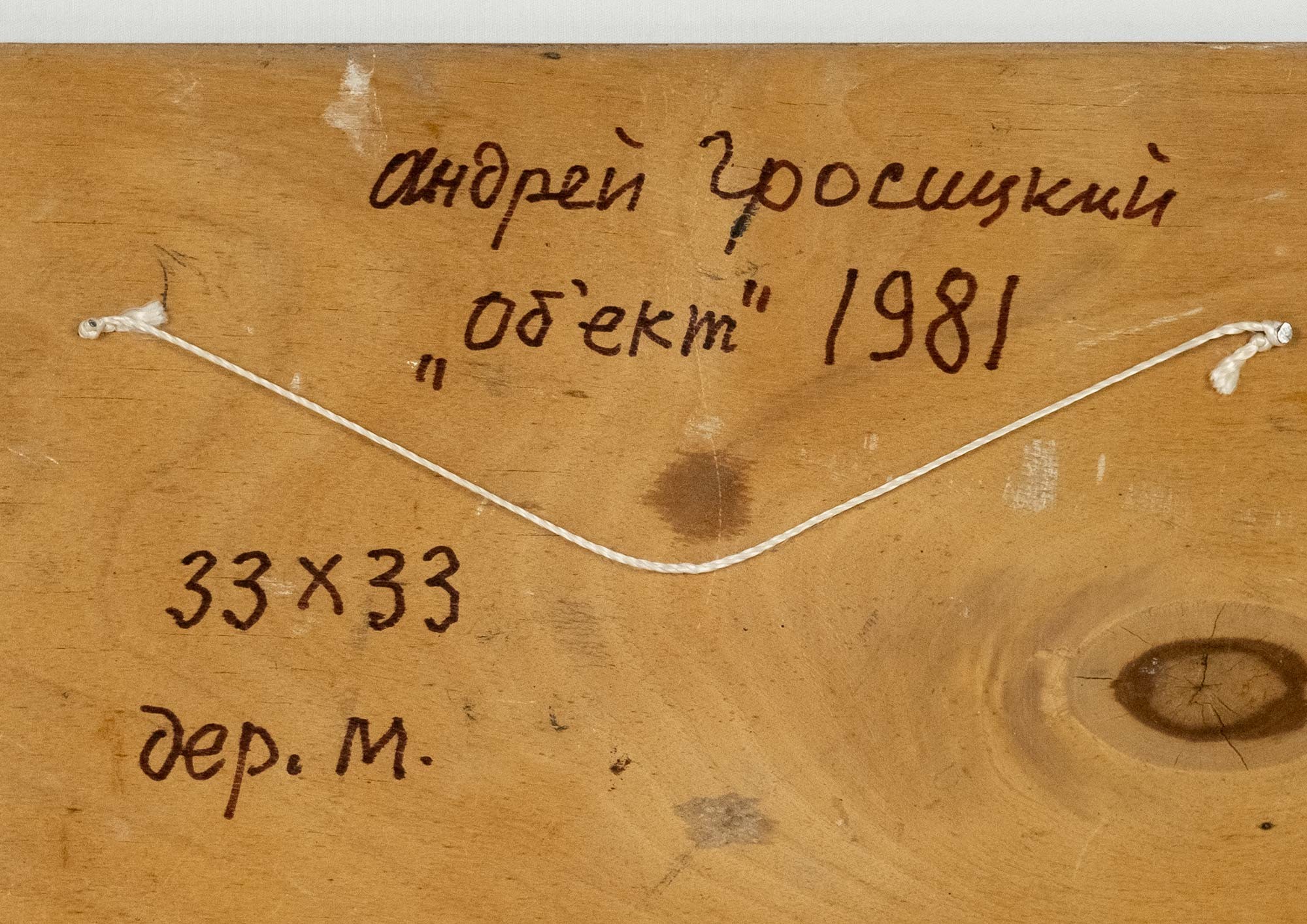 На обороте авторская подпись, надпись и дата: Андрей Гросицкий / «Об’ект» 1981 / 33 × 33 / дер. м.