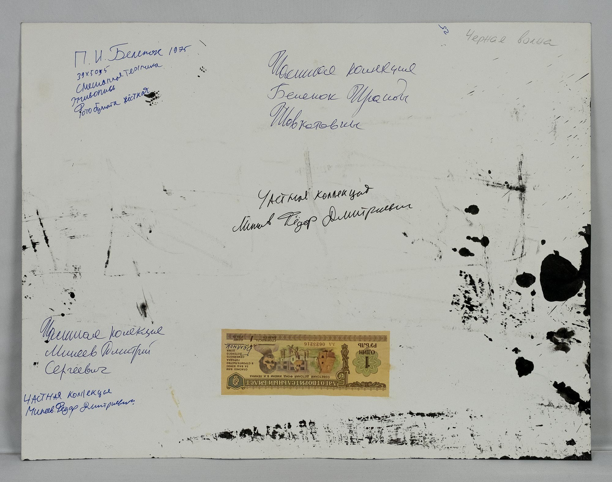 На обороте — владельческие надписи и штампы коллекций, а также благотворительный билет Советского Детского фонда им. В. И. Ленина с подписью Петра Беленка