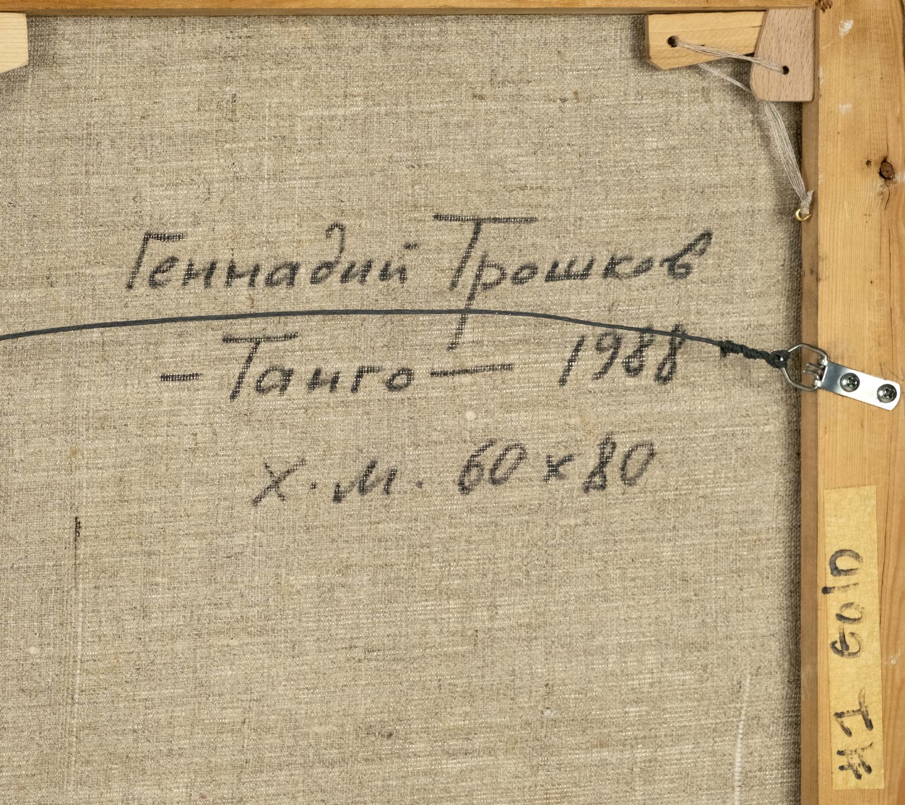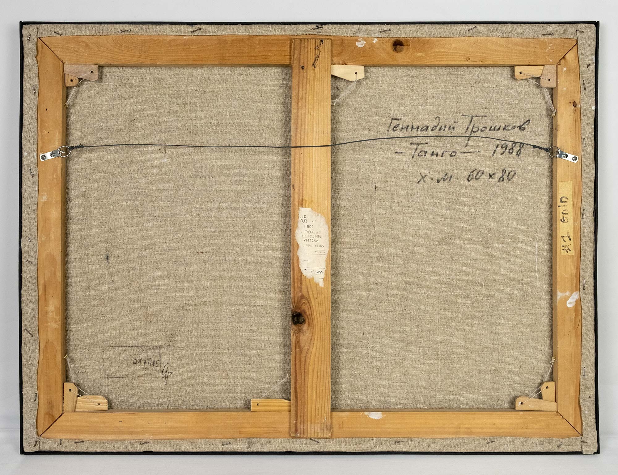На обороте подпись, название и дата: Геннадий Трошков / — Танго — 1988 / х. м. 60 × 80