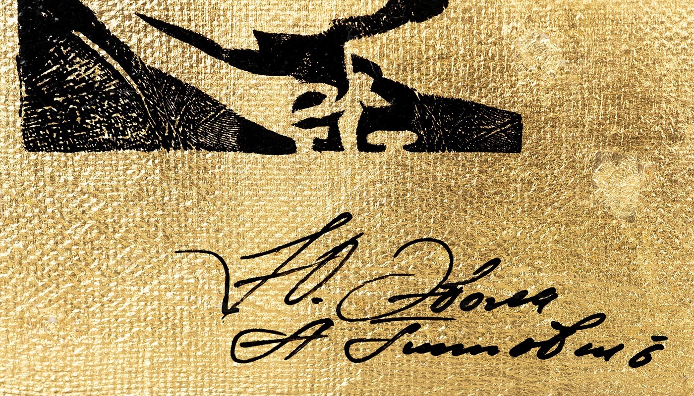 Юлиус Эвола Холст, золотая краска, типографская краска. 30 × 25 Справа внизу название и подпись: Ю. Эвола / АГинтовтъ На обороте название, авторская подпись и дата: Юлиус Эвола / Алексей Беляев-Гинтовт / 2010
