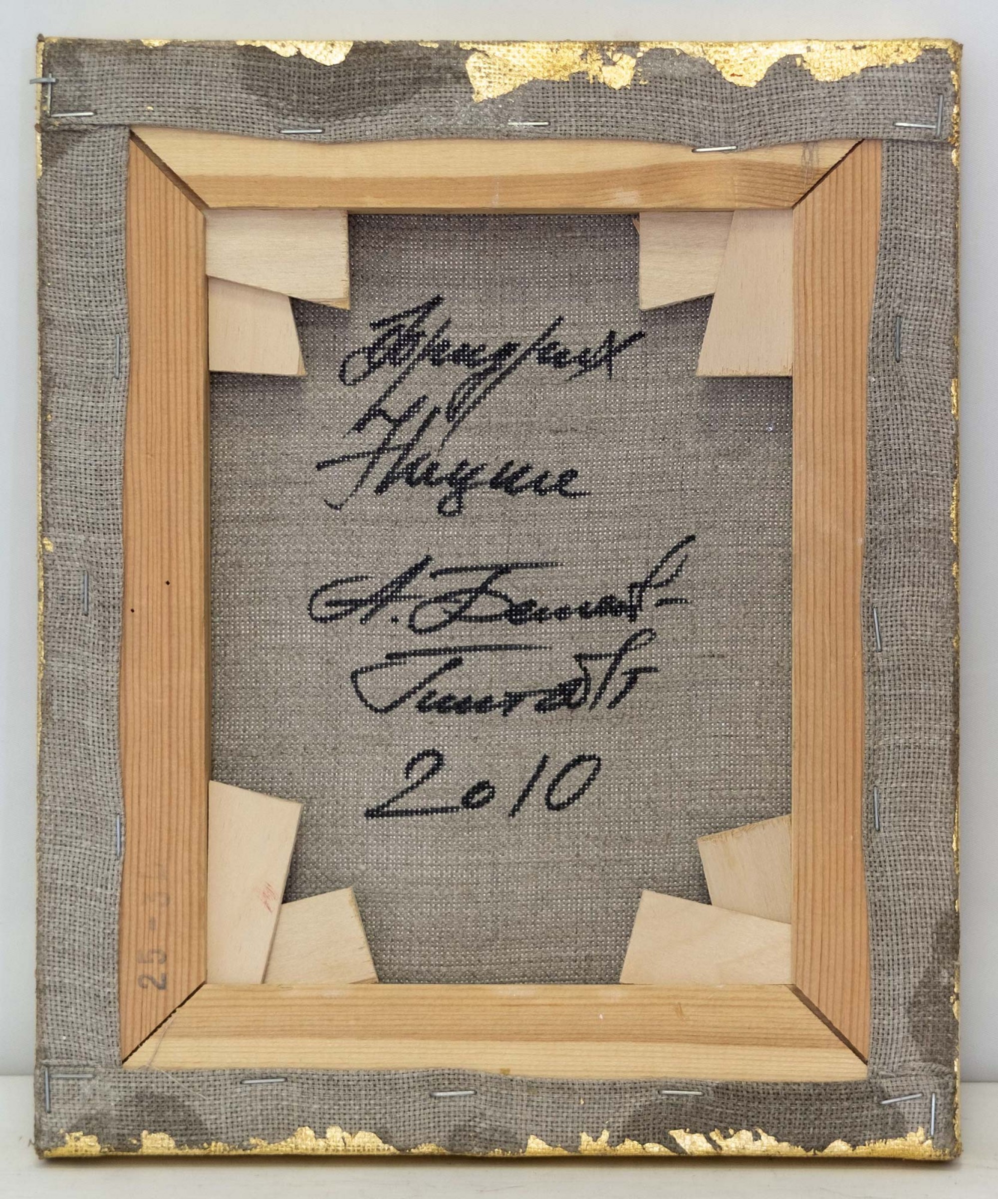 Фридрих Ницше Холст, золотая краска, типографская краска. 30 × 25 Справа внизу название и подпись: Ф. Ницше / АГинтовтъ На обороте название, авторская подпись и дата: Фридрих Ницше / А. Беляев-Гинтовт / 2010