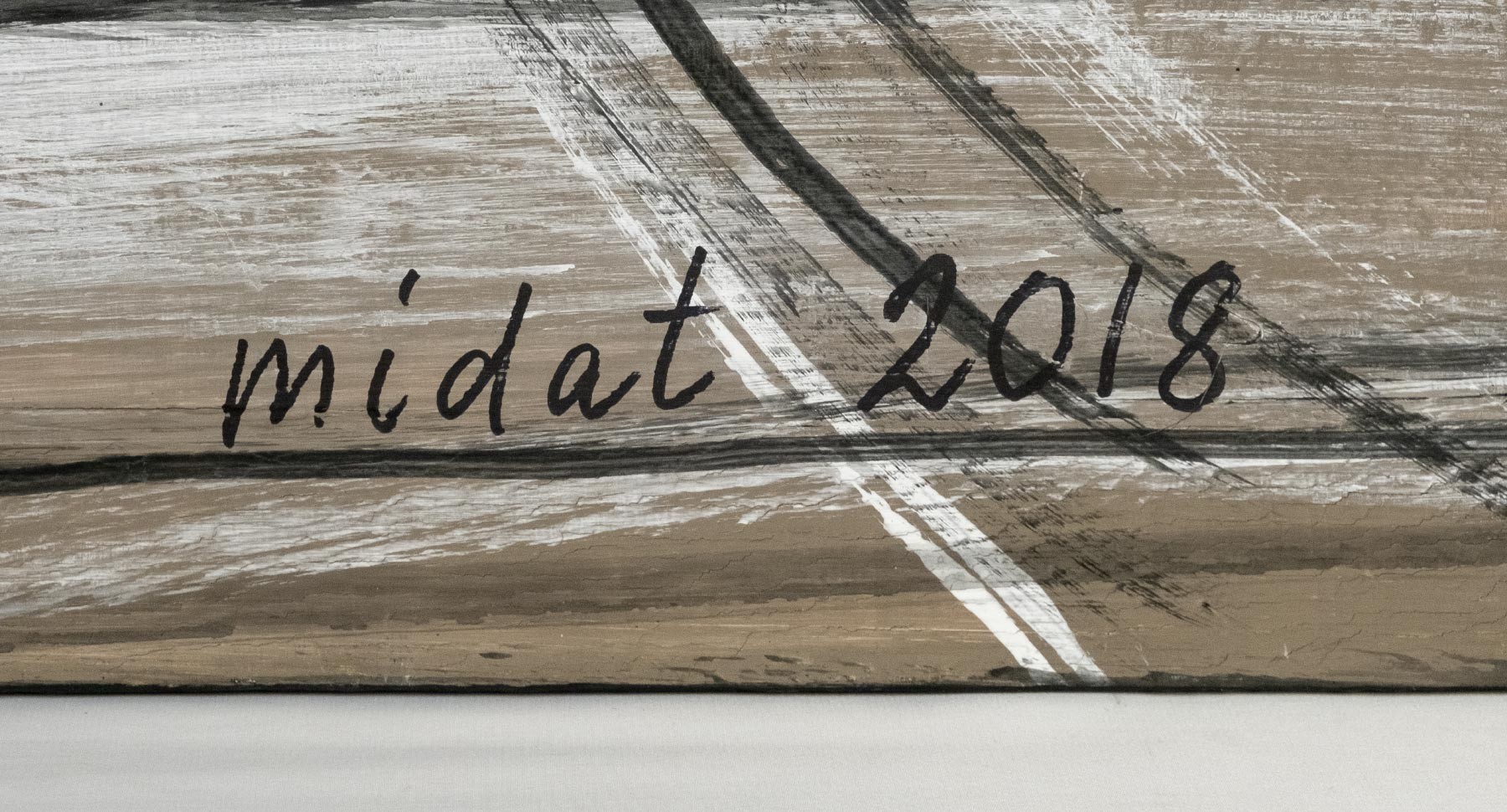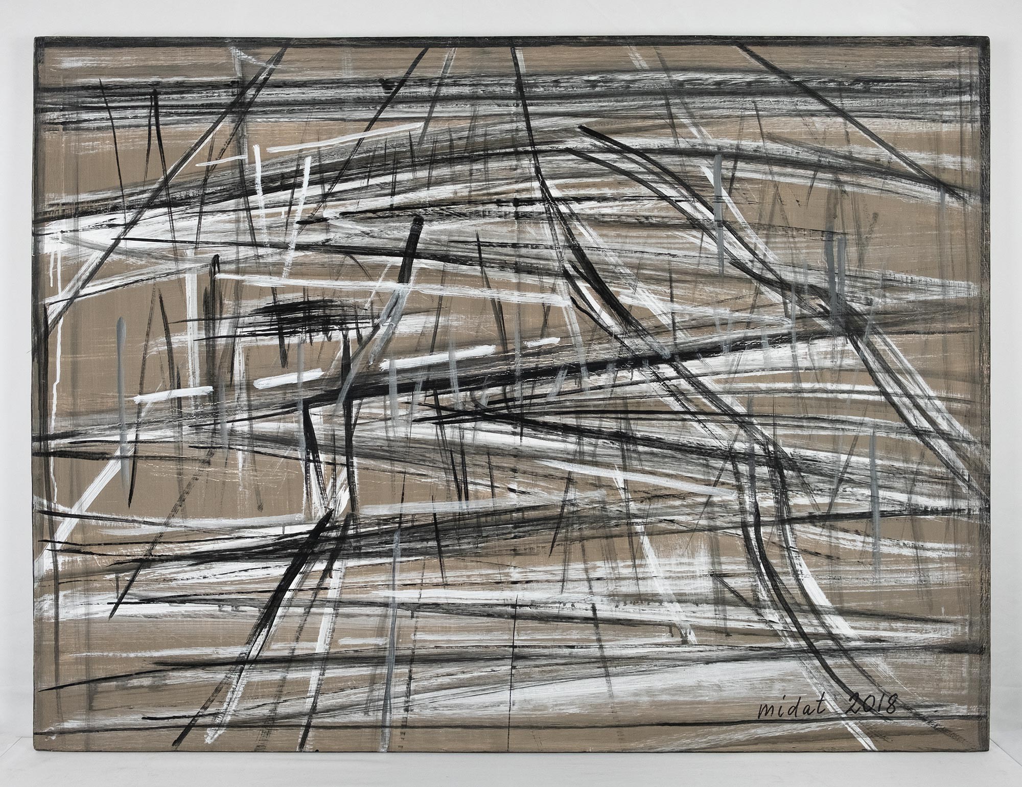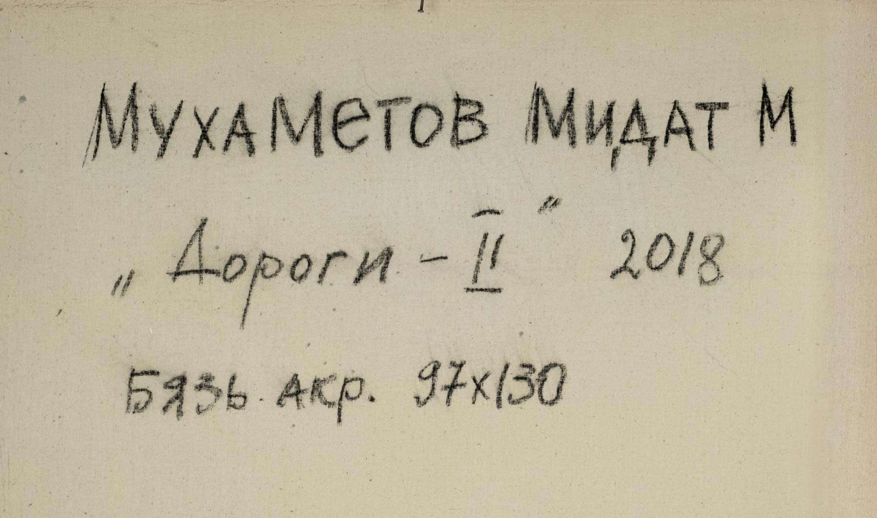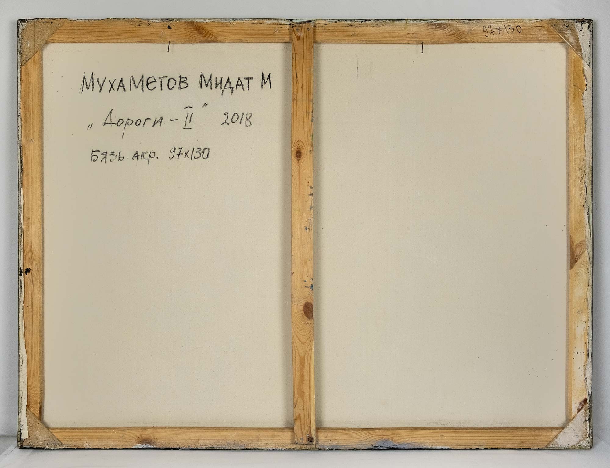 На обороте авторская надпись: Мухаметов Мидат М / «Дороги — II» 2018 / бязь, акр. 97 × 130