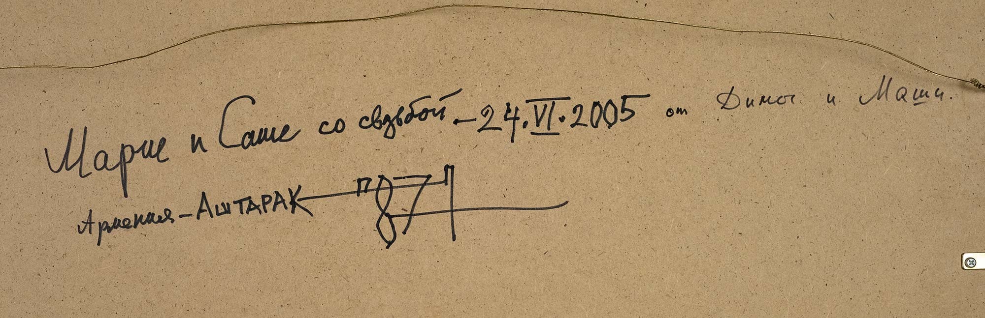 На монтировочном картоне с оборота дарственная надпись, подпись и дата: Марине и Саше со свадьбой — 24-VI-2005 от Димы и Маши. / Армения — Аштарак Д 87 П