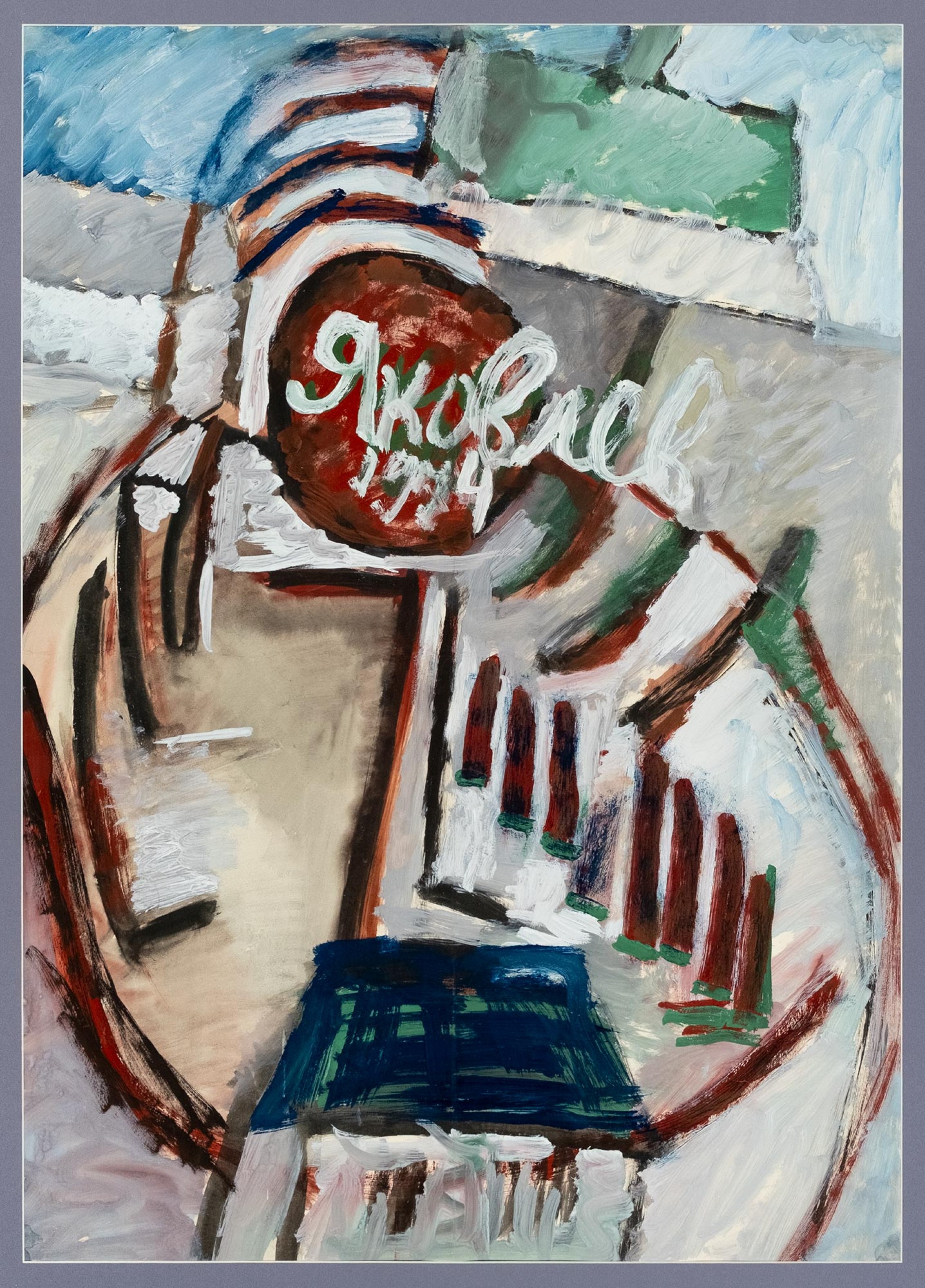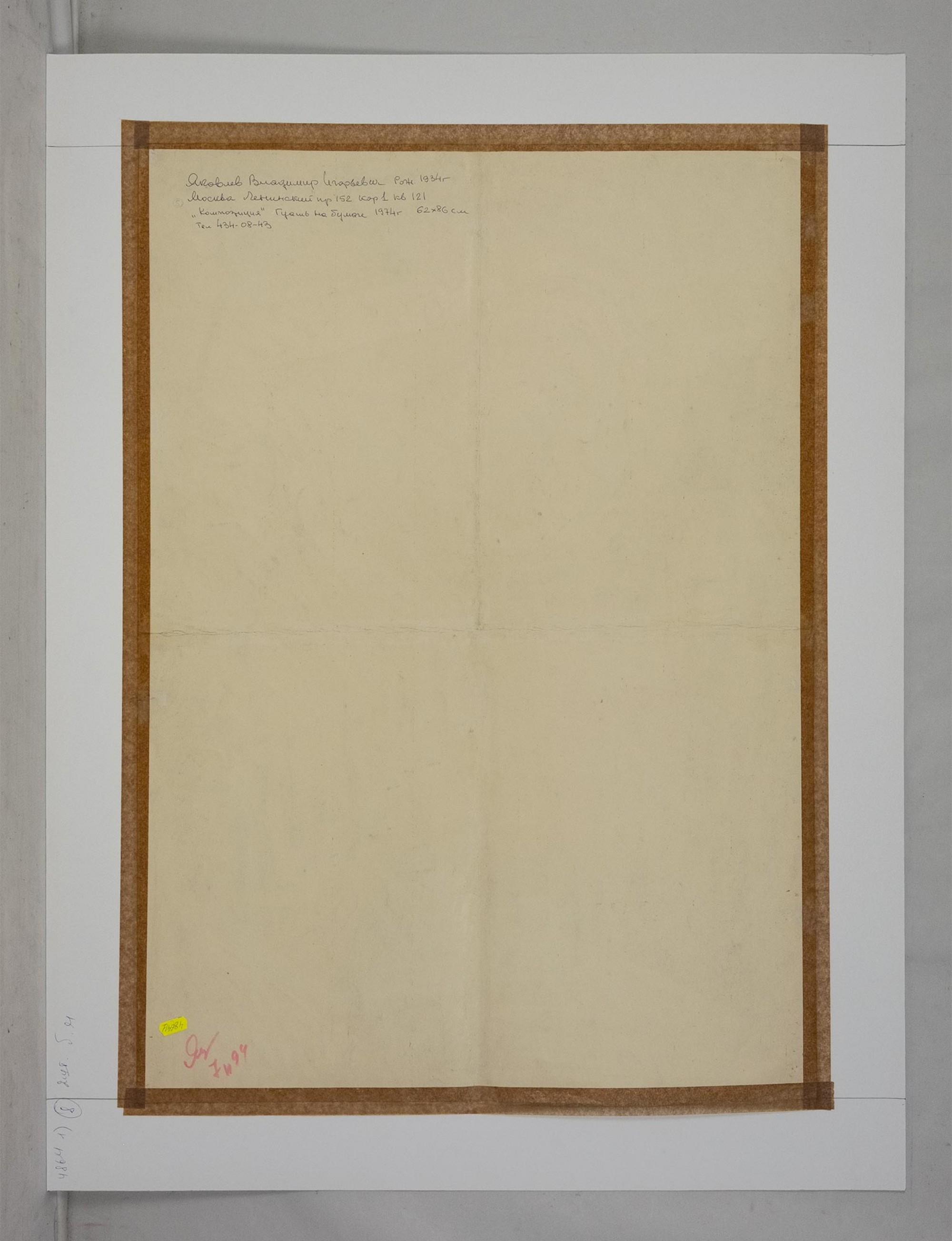 На обороте надпись для выставки с указанием адреса и телефона сестры художника