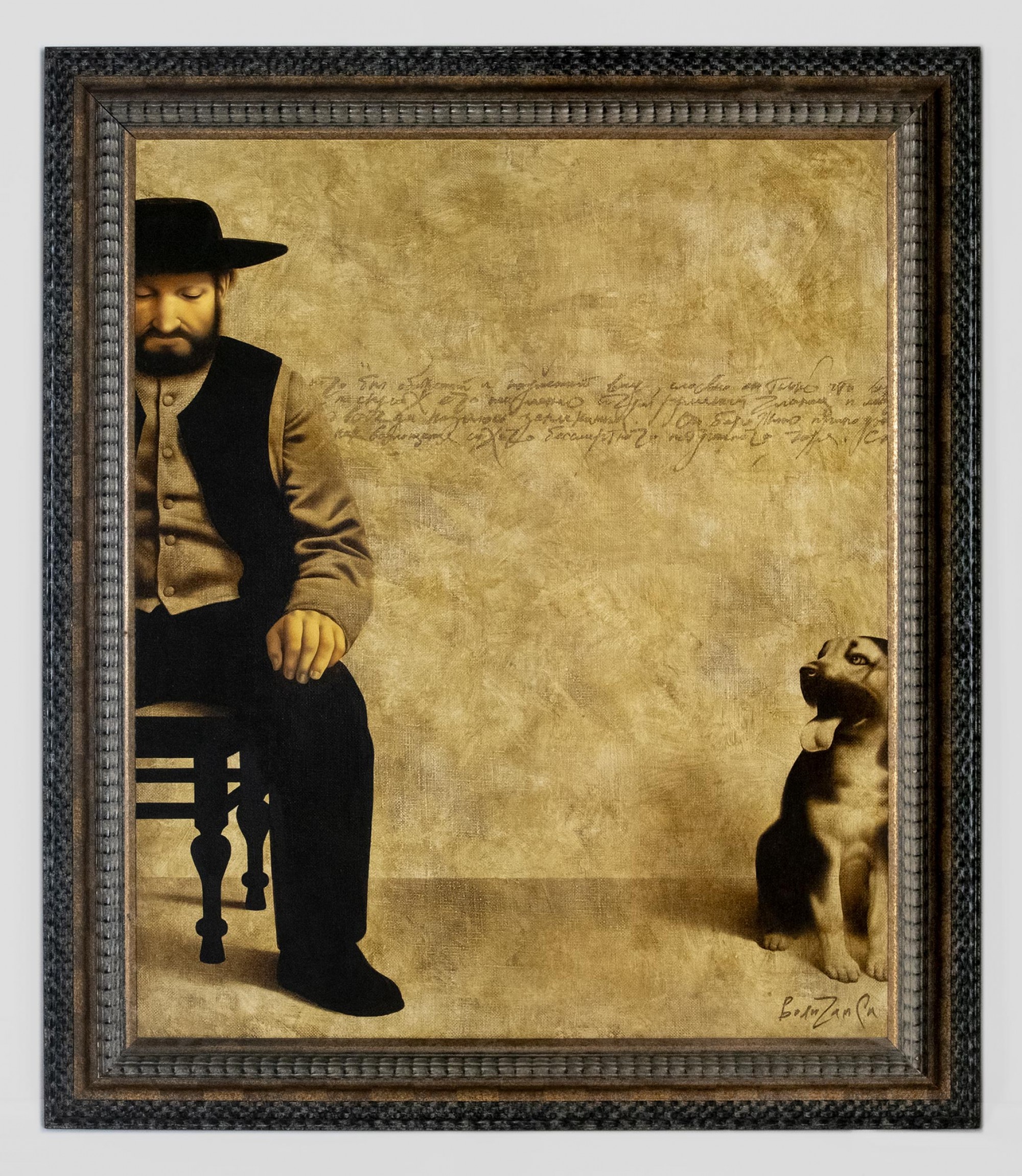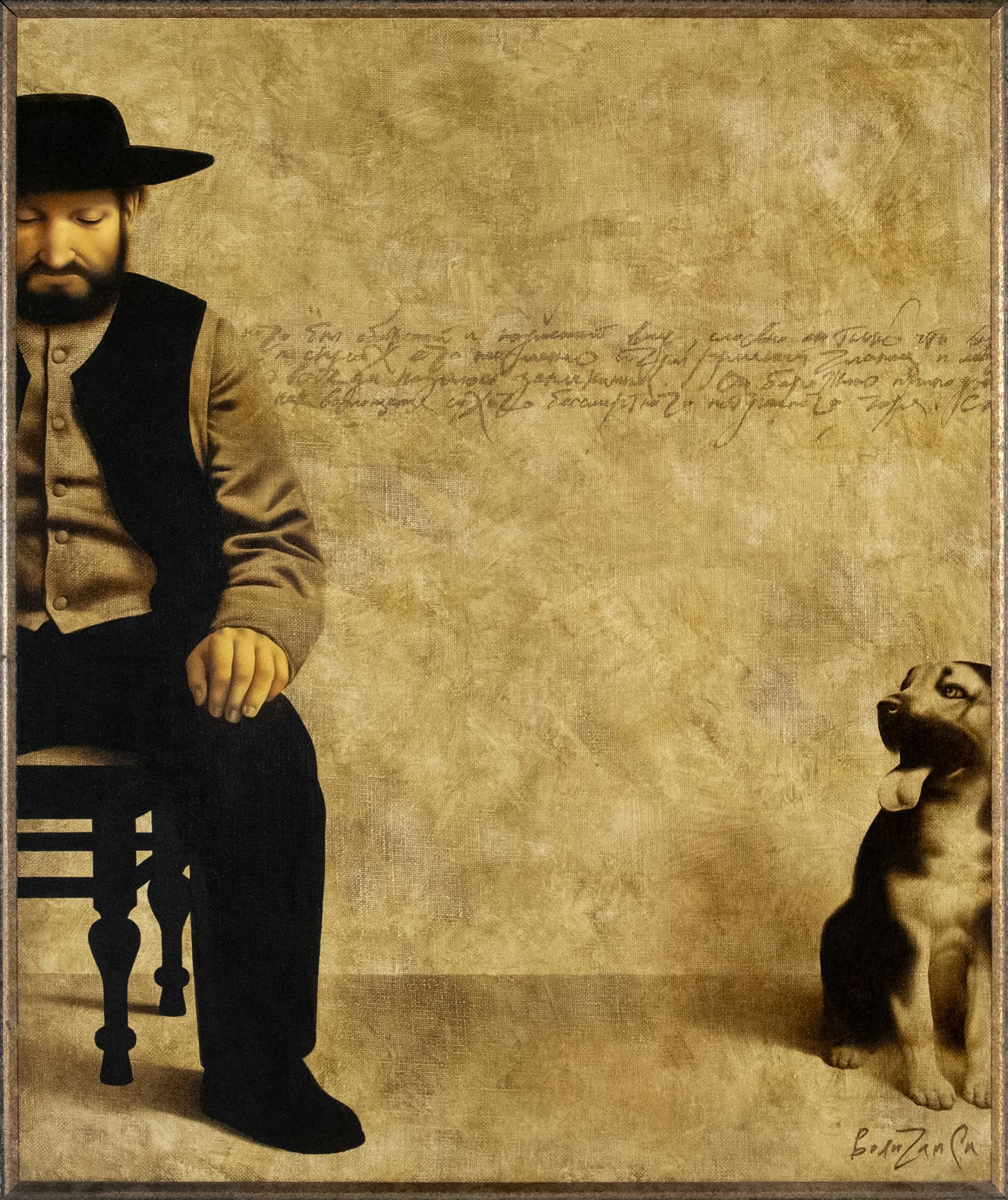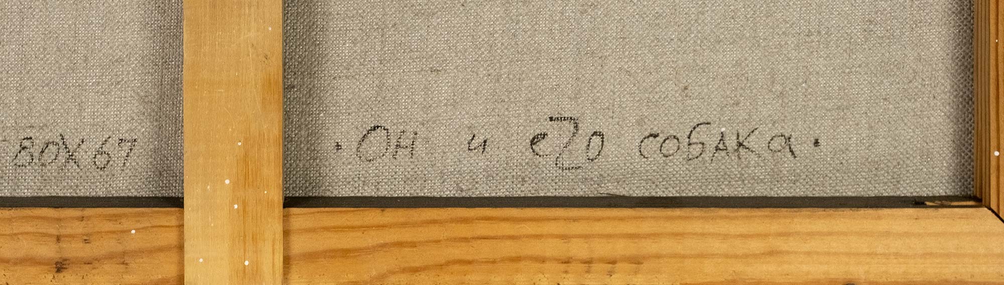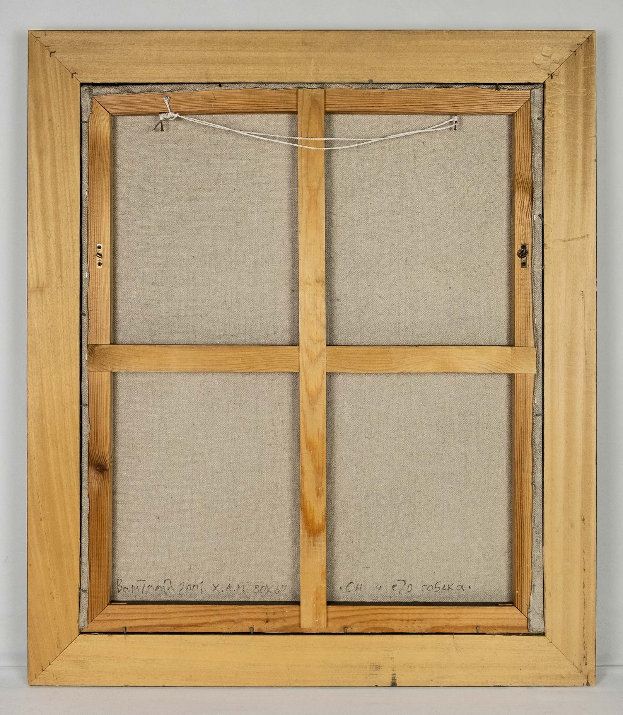На обороте подпись, дата и название: ВолиГамСи 2001 х. а. м. 80 × 67 «Он и еГо собака»