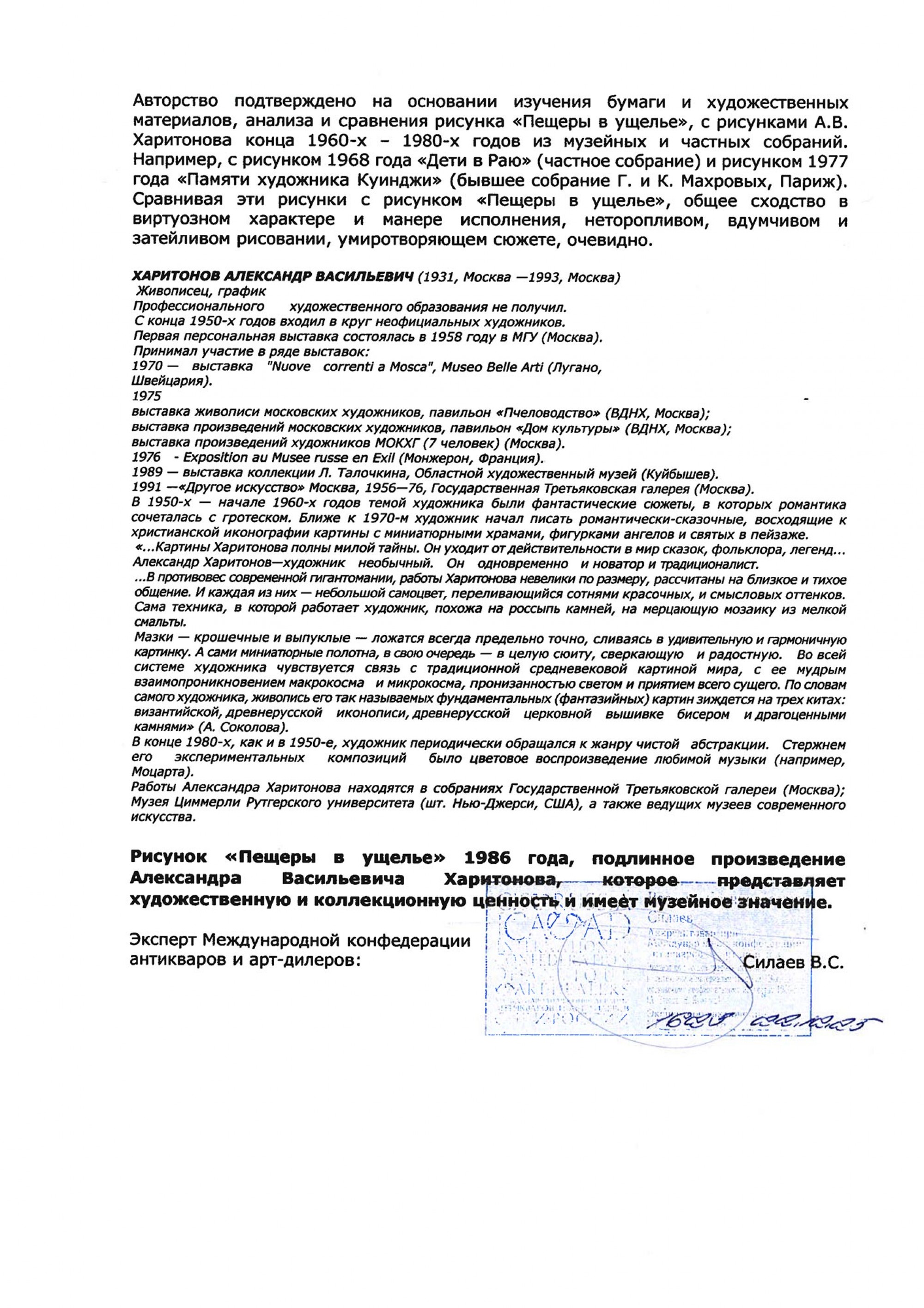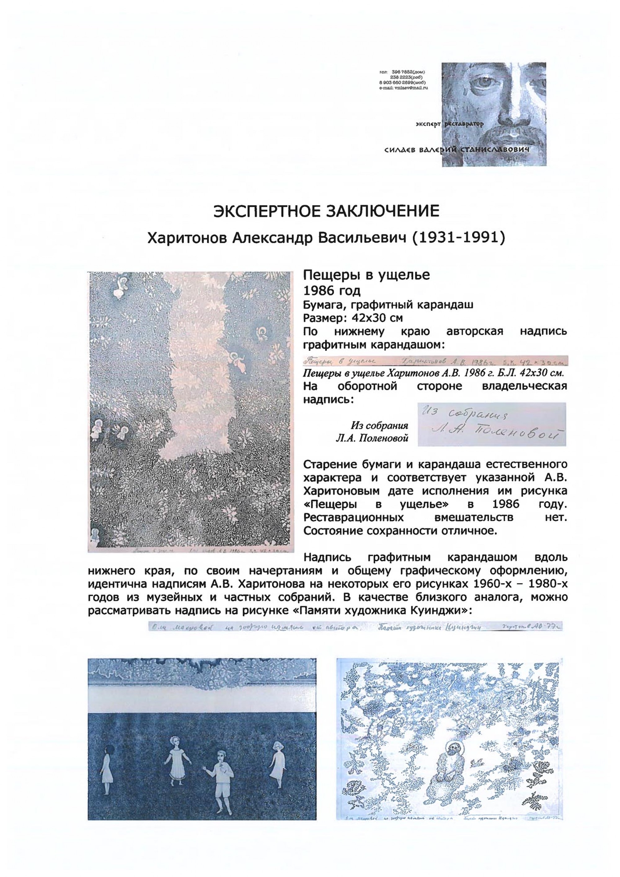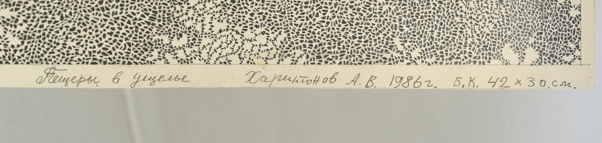 На нижней кромке (скрыта паспарту) название, подпись и дата: Пещеры в ущелье Харитонов А. В. 1986 г. б. к. 42 × 30 см.