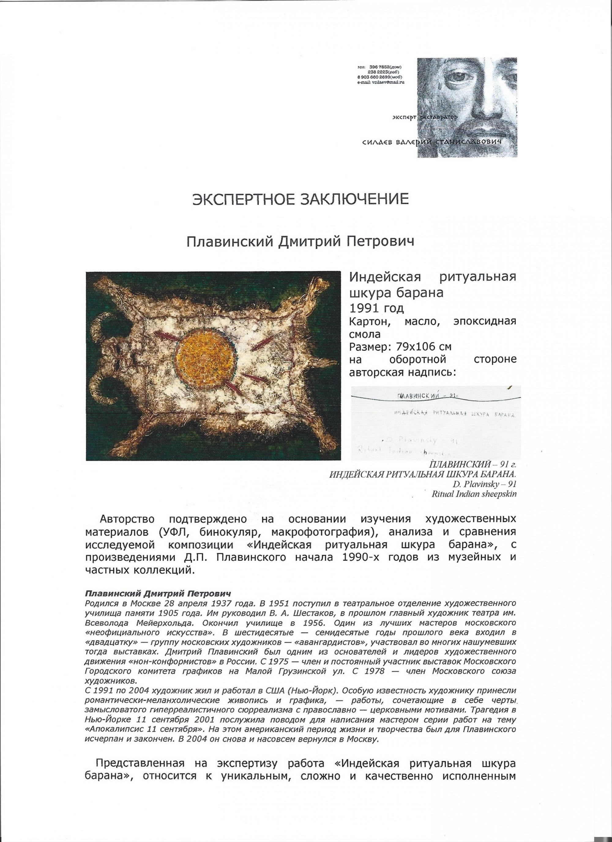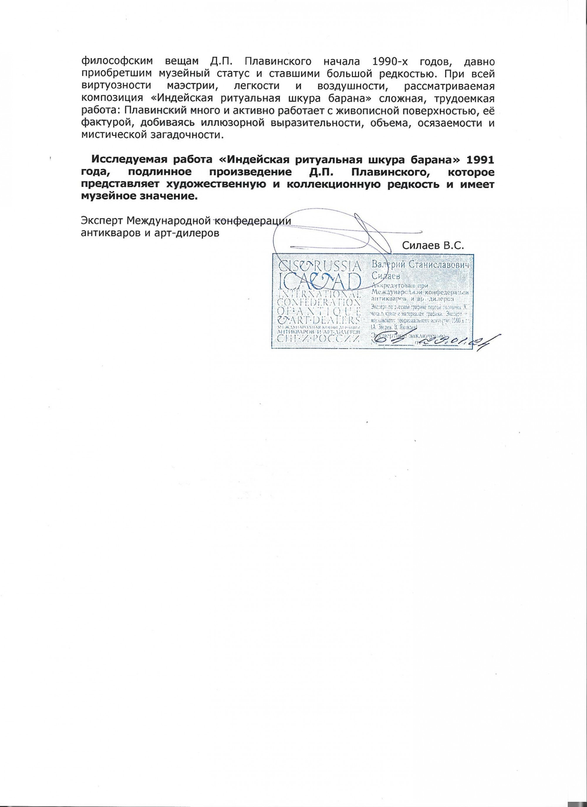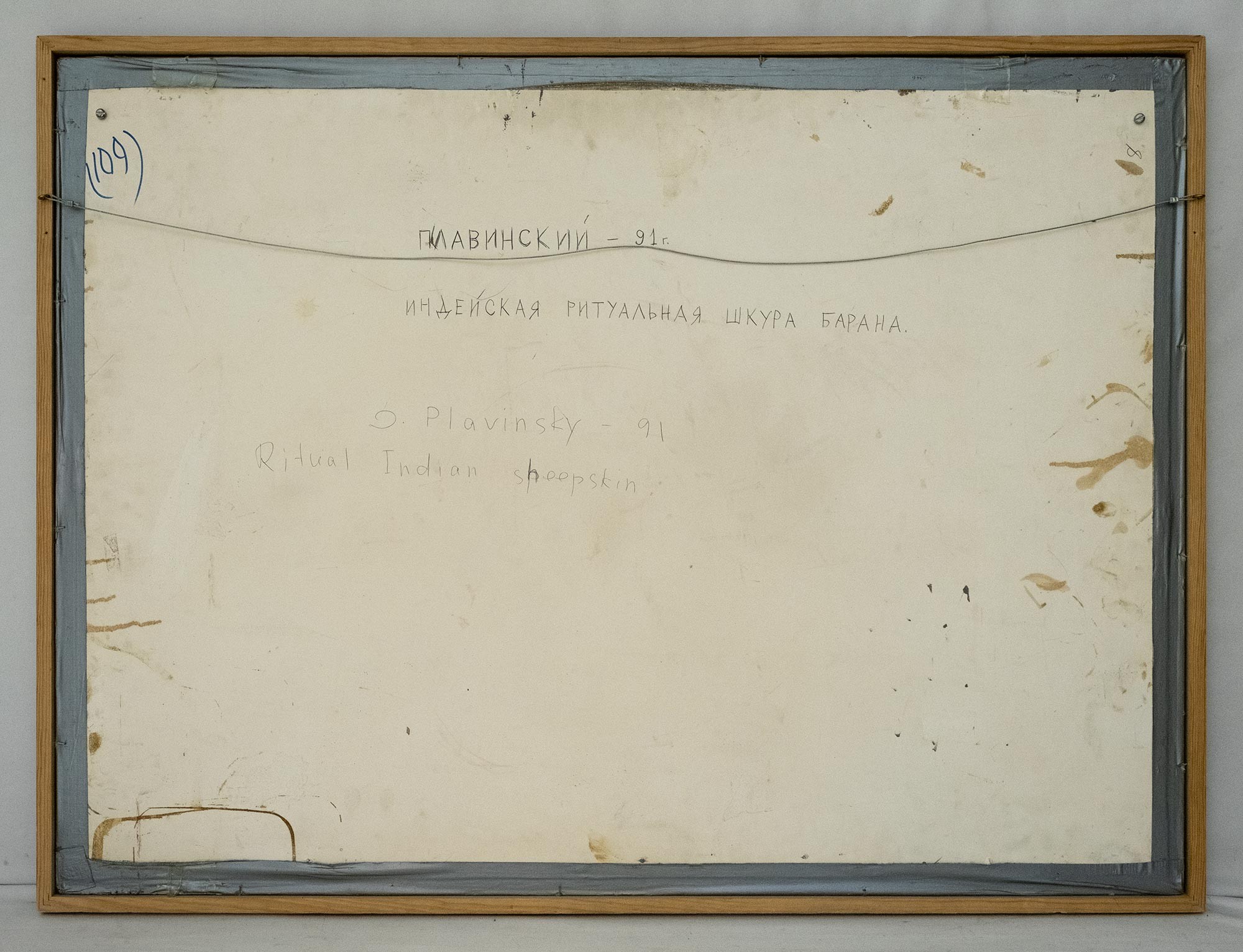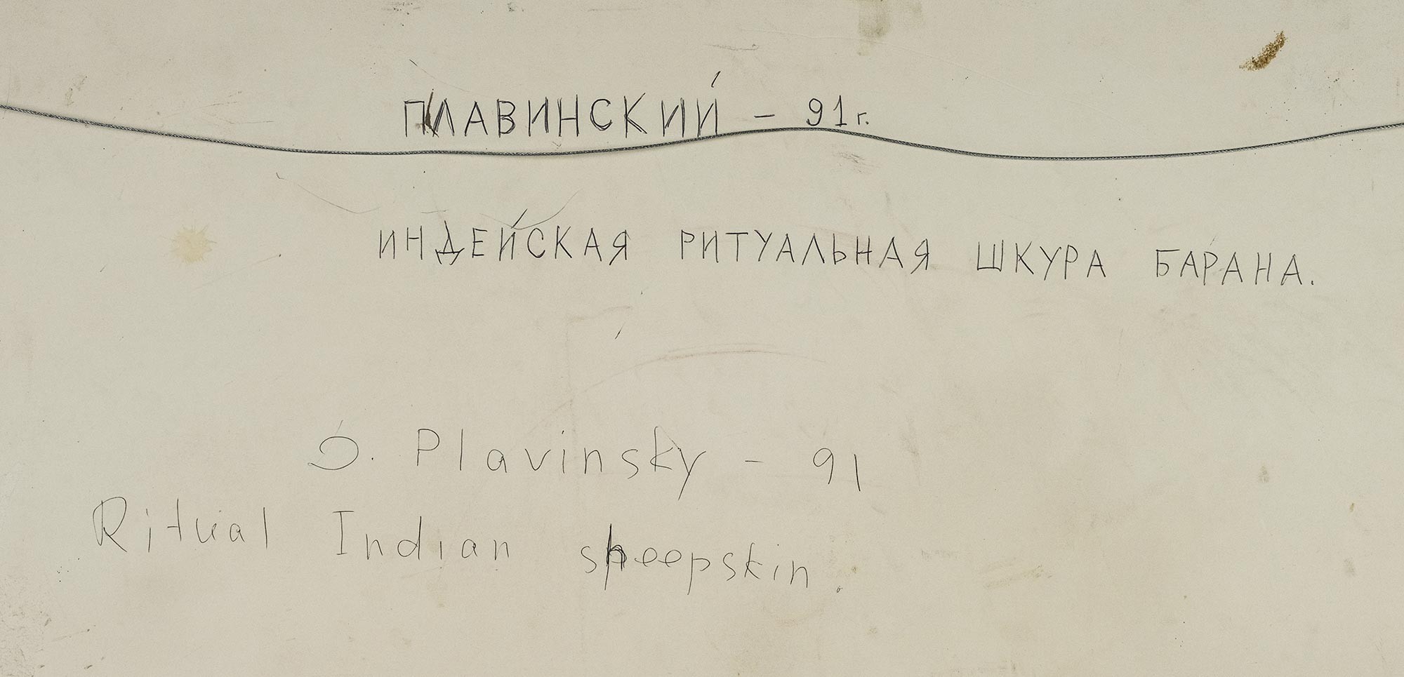На обороте автор, название и дата: ПЛАВИНСКИЙ — 91 г. / ИНДЕЙСКАЯ РИТУАЛЬНАЯ ШКУРА БАРАНА. / D. Plavinsky — 91 / Ritual Indian sheepskin