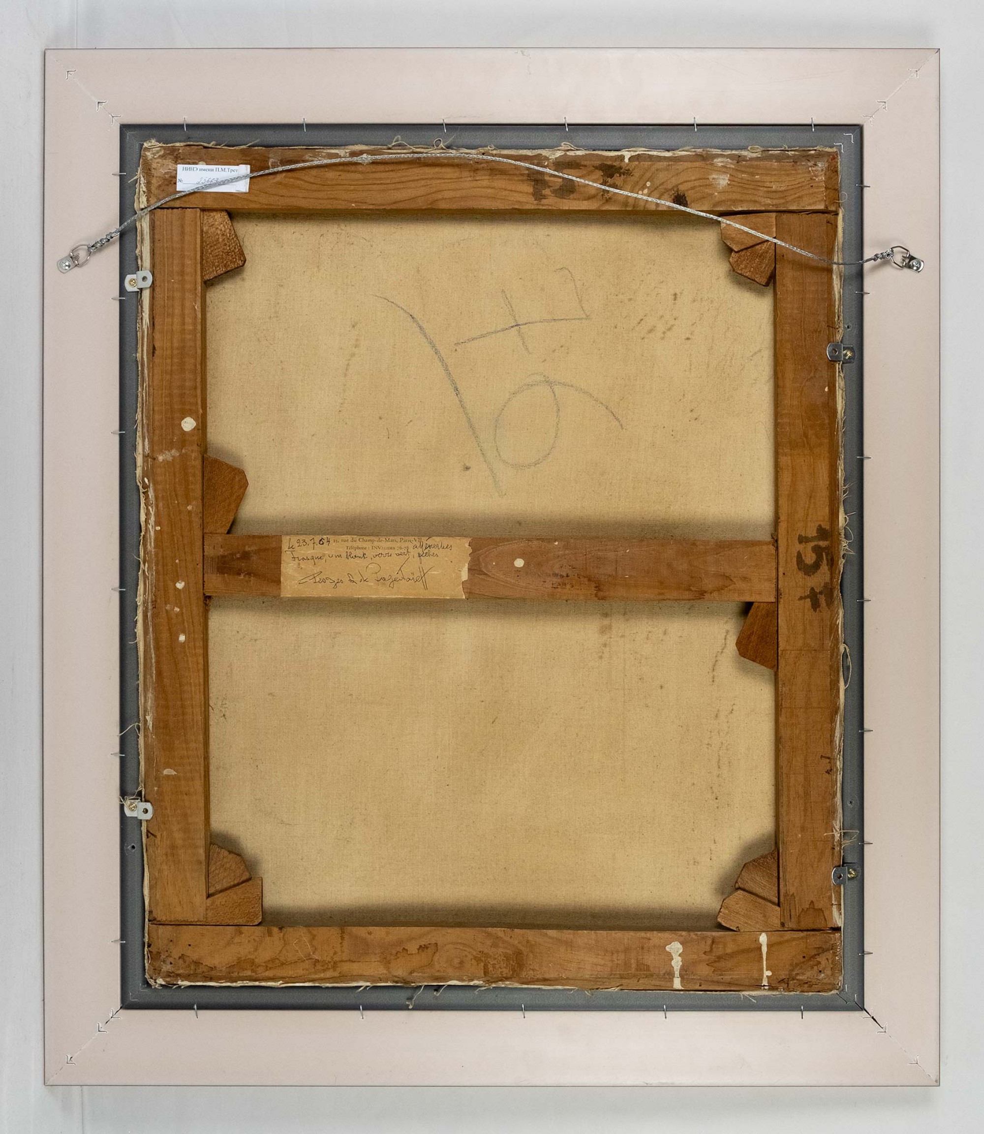 На подрамнике бумажная этикетка с вписанной от руки фамилией автора, его адресом и датой создания работы
