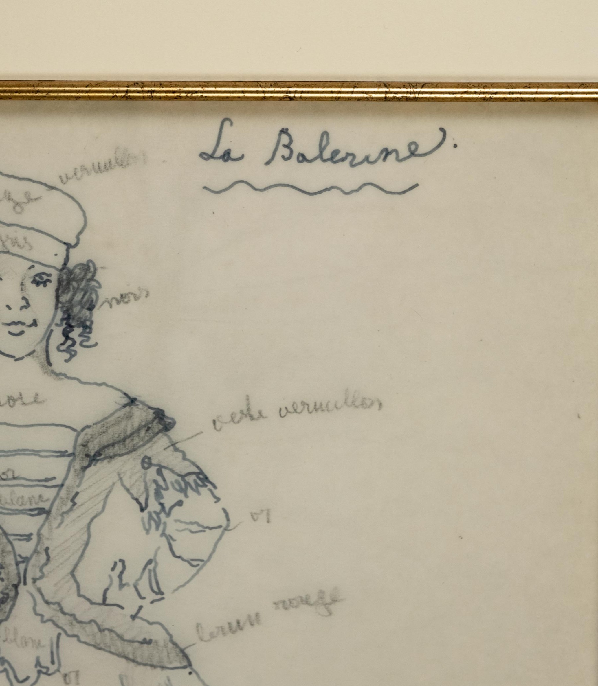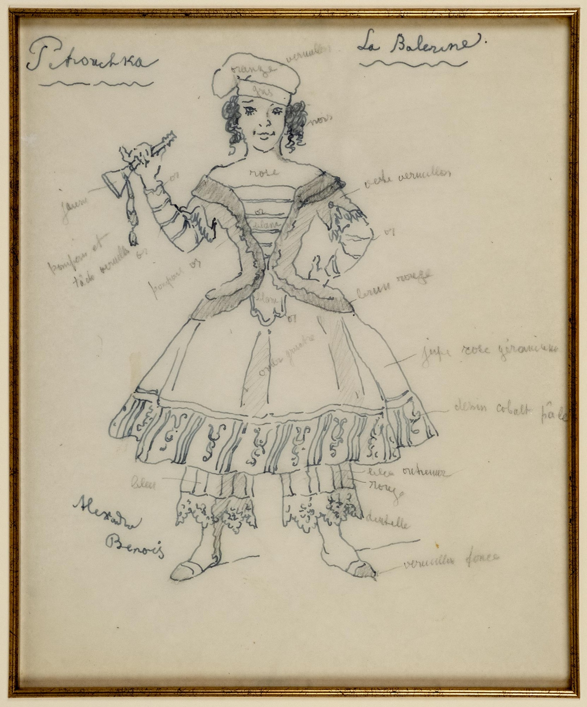 По листу многочисленные авторские надписи графитным карандашом с указанием цветов тканей деталей костюма