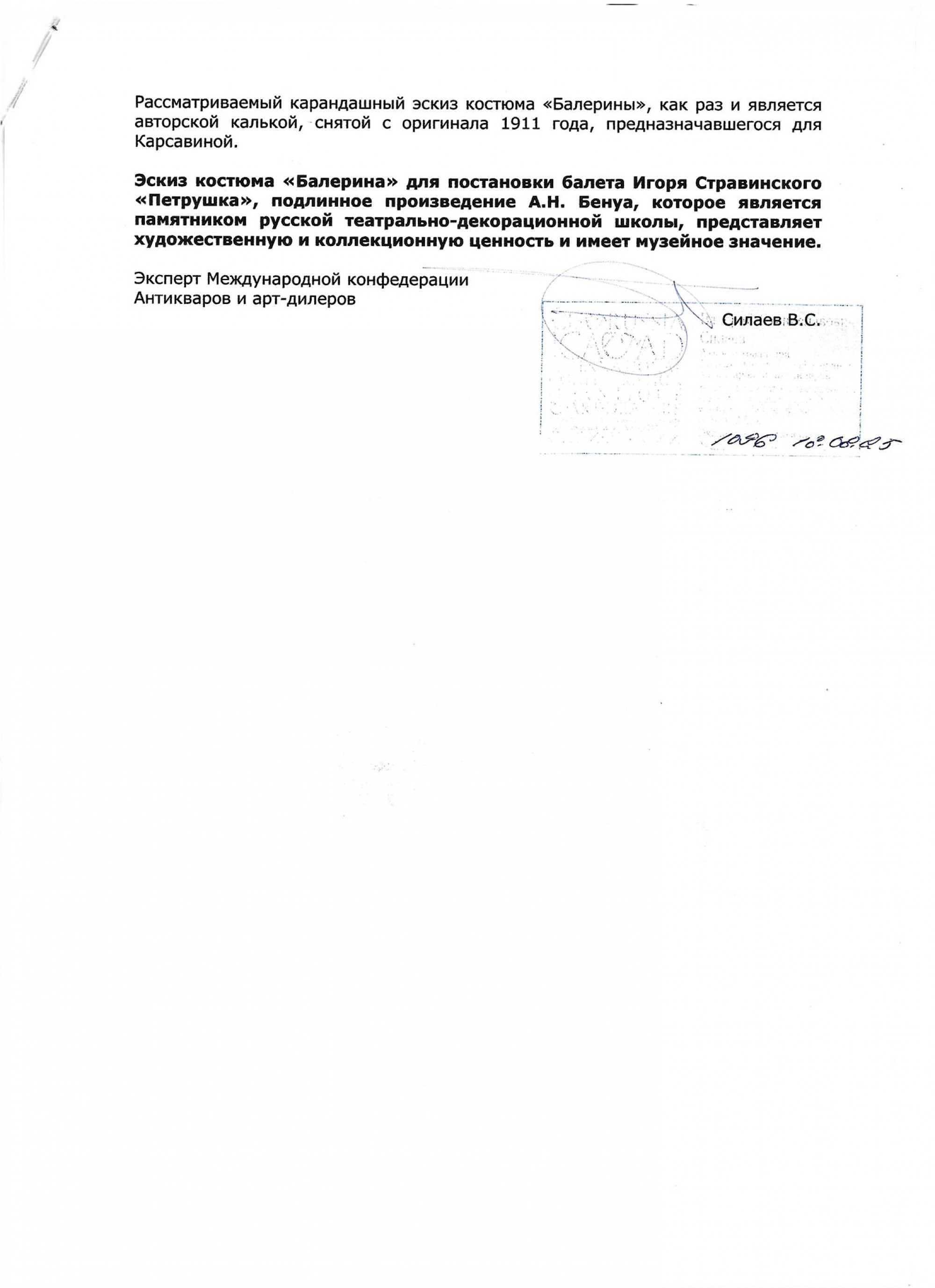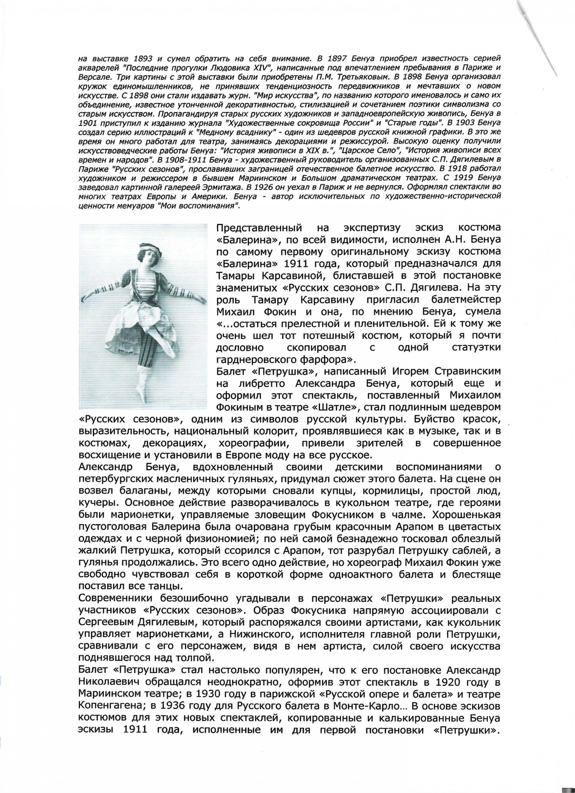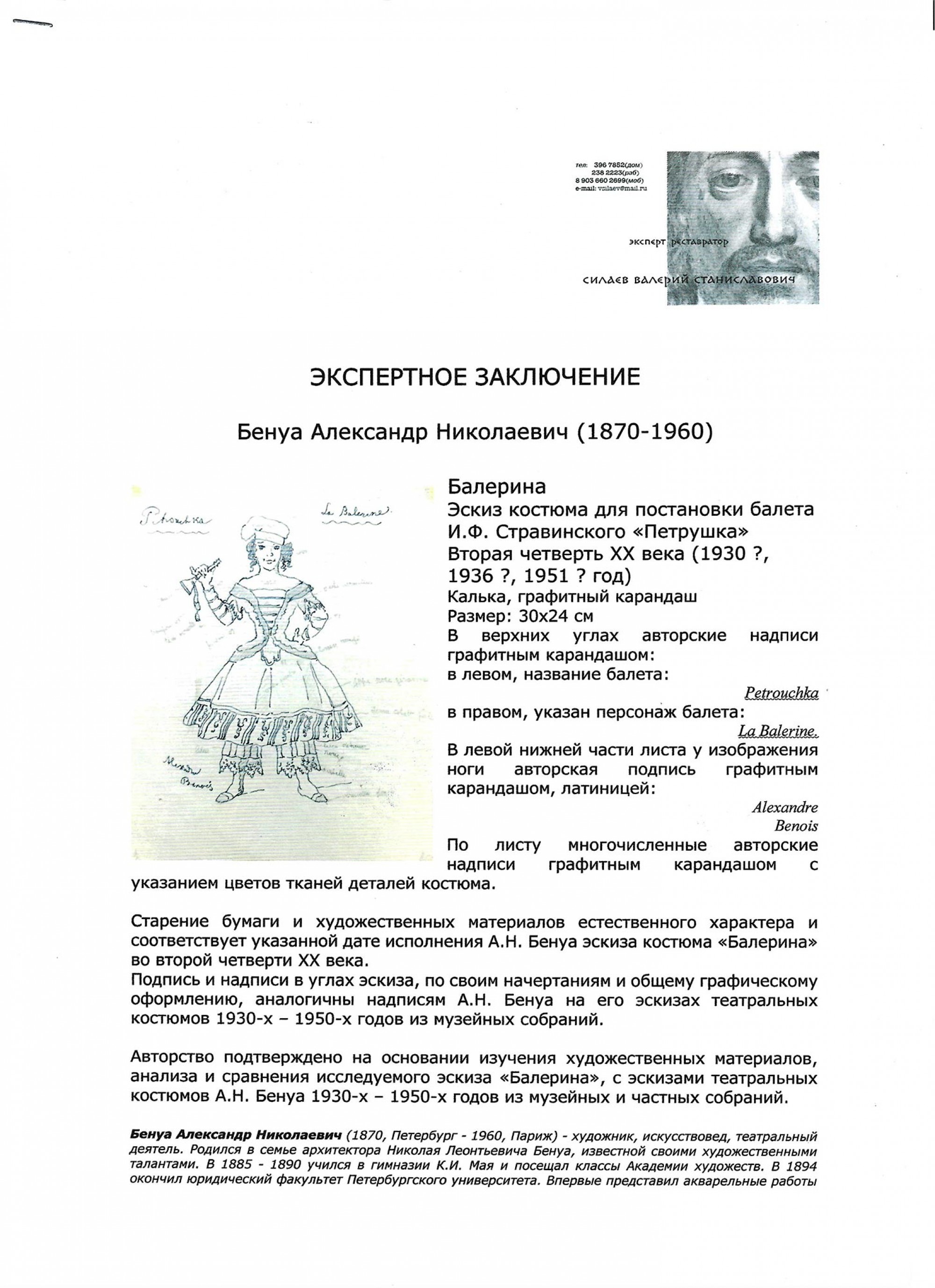 БЕНУА Александр Николаевич (1870–1960) Балерина. Эскиз костюма для постановки балета И. Ф. Стравинского «Петрушка». Вторая четверть ХХ века ID лота: 113287