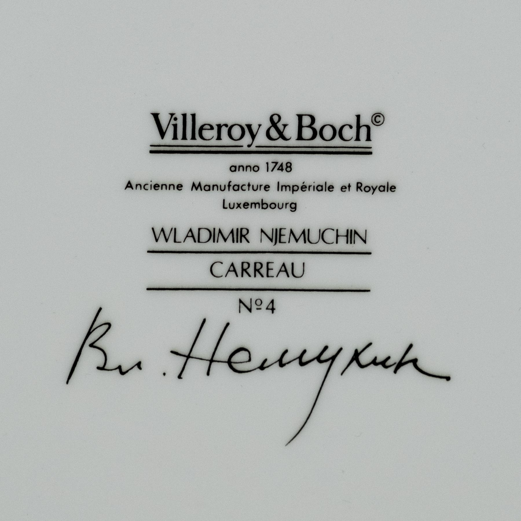 На обороте клеймо фабрики-производителя, название серии и подпись: Villeroy&Boch / WLADIMIR NJEMUCHIN / CARREAU / № 4 / Вл. Немухин