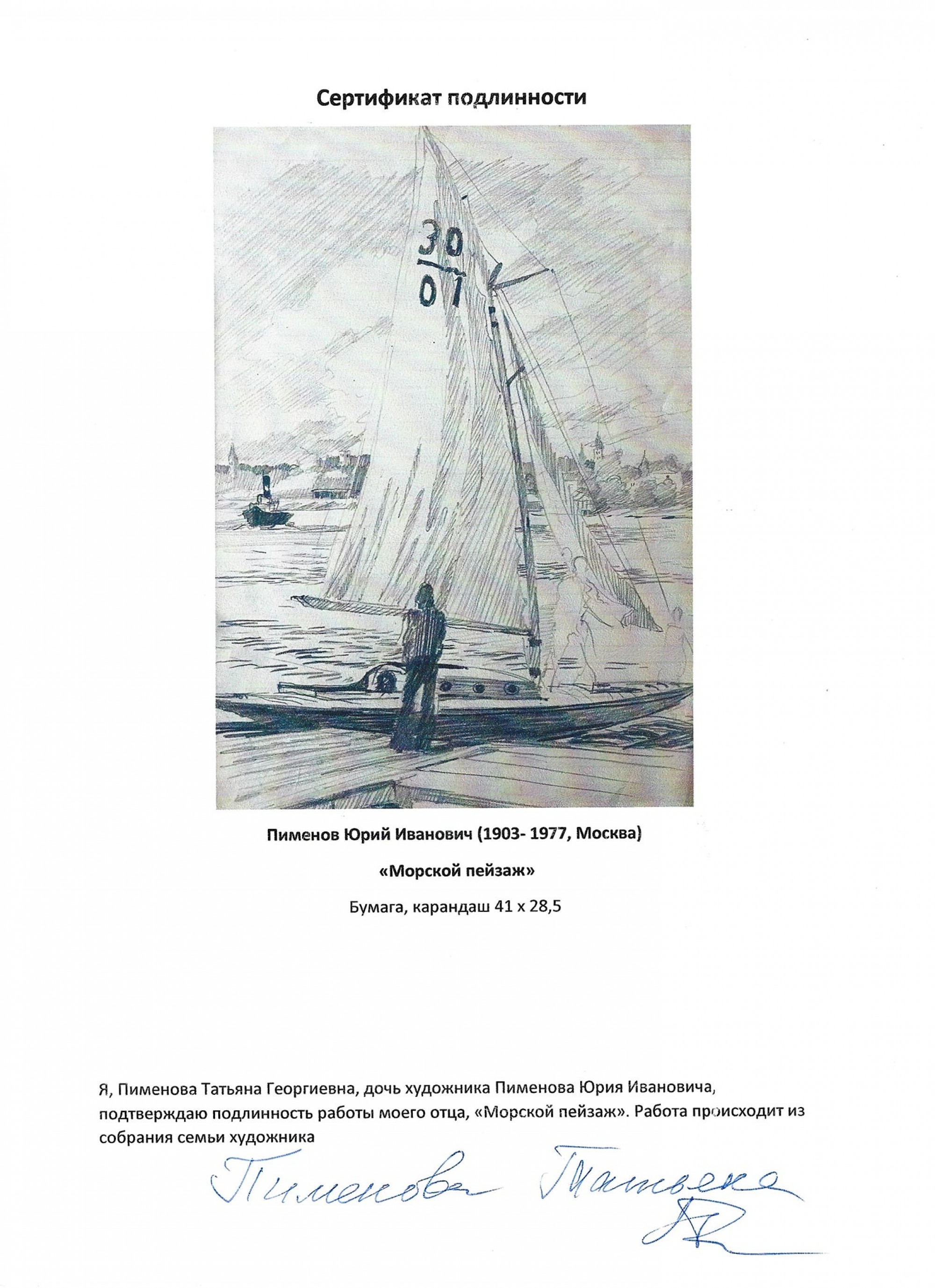 Подтверждение подлинности от Татьяны Пименовой, дочери Ю. И. Пименова