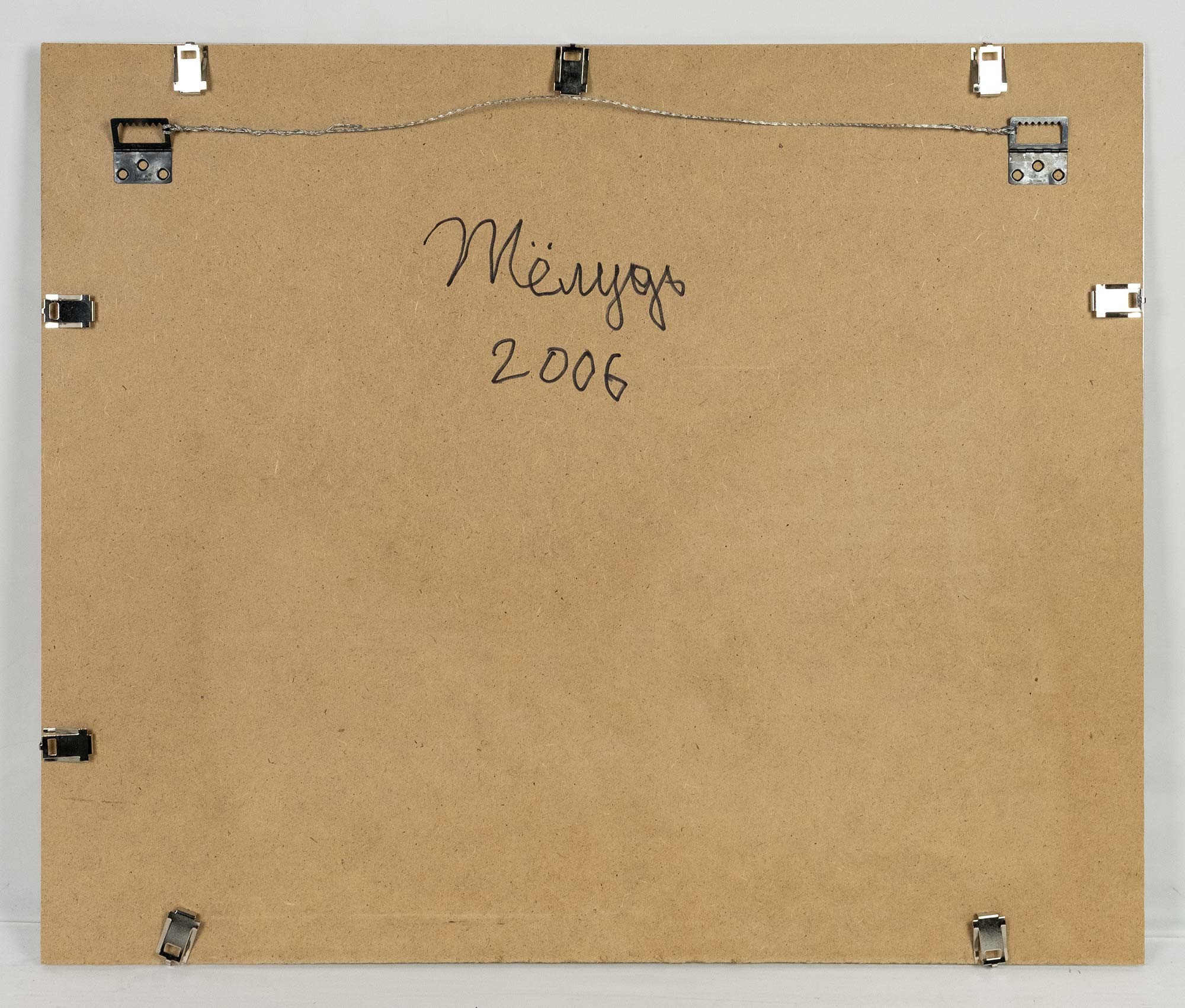Лист бумаги прижат к оргалиту оргстеклом. На обороте оргалита подпись и дата: Жёлудь / 2006