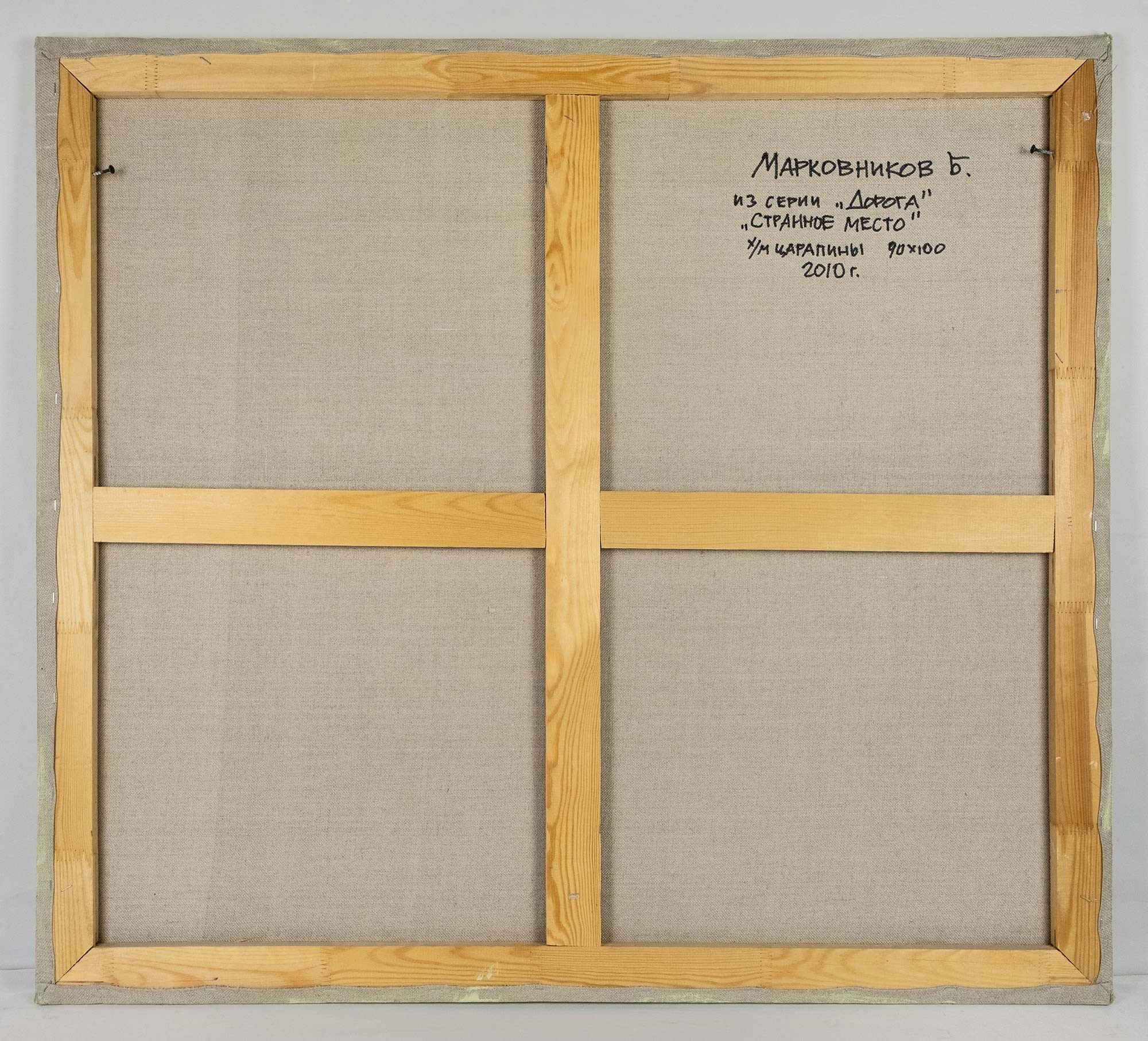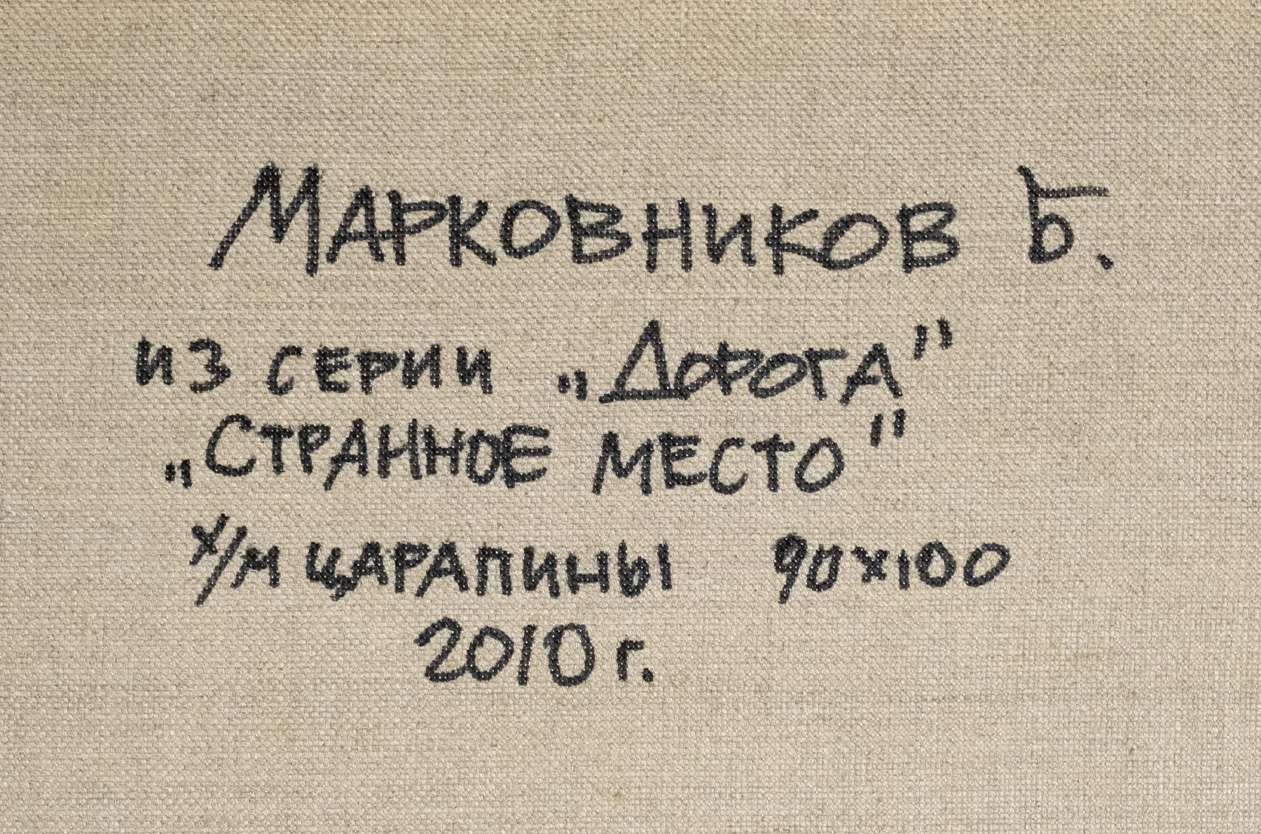 На обороте авторская надпись: Марковников Б. / из серии «Дорога» / «Странное место» / х/м царапины 90 × 100 / 2010 г.