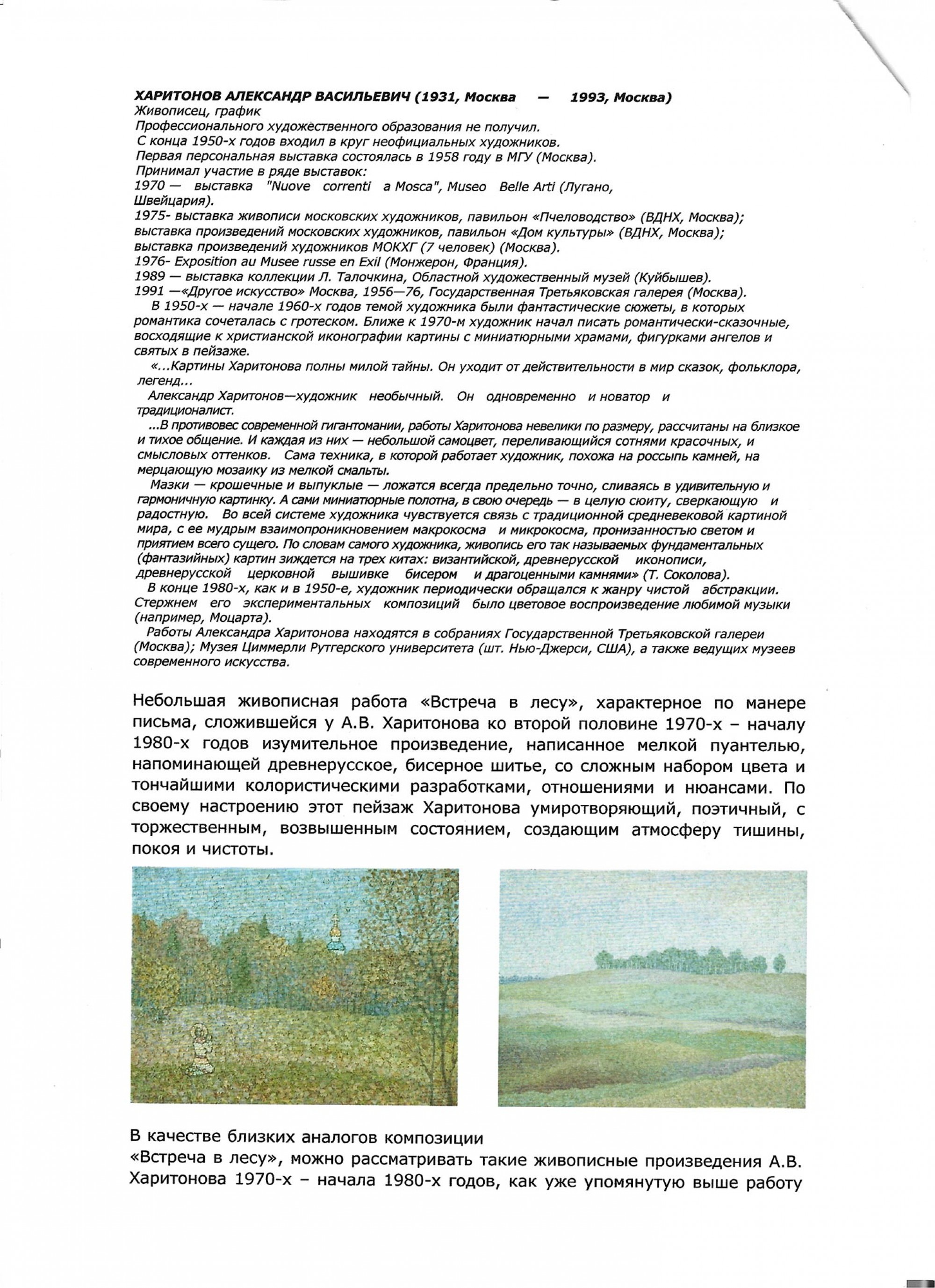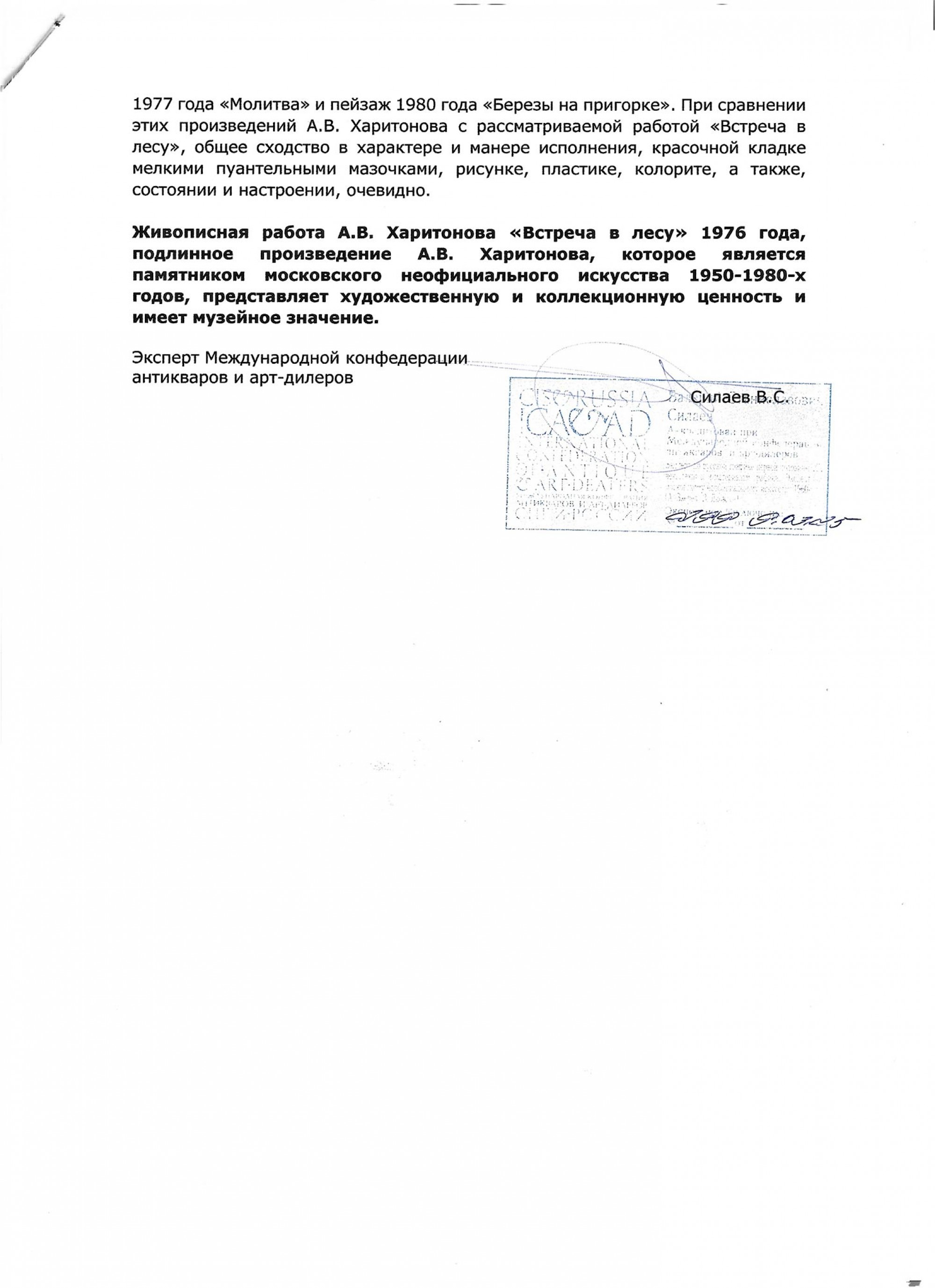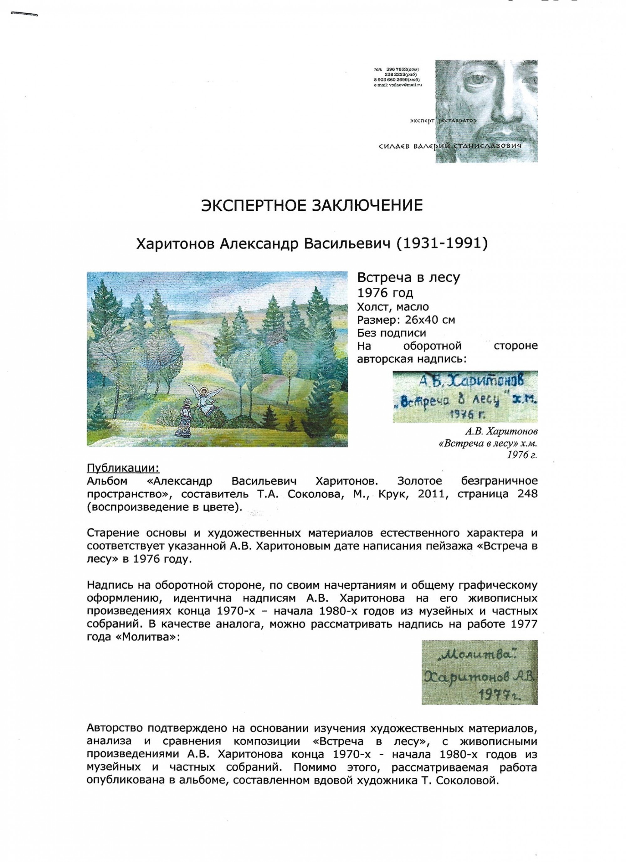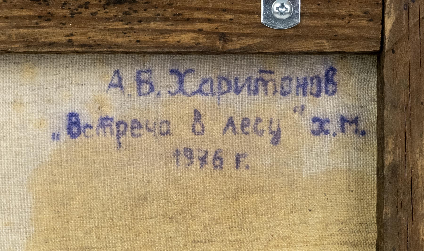 На обороте подпись, название и дата: А. В. Харитонов / «Встреча в лесу» х. м. / 1976 г.