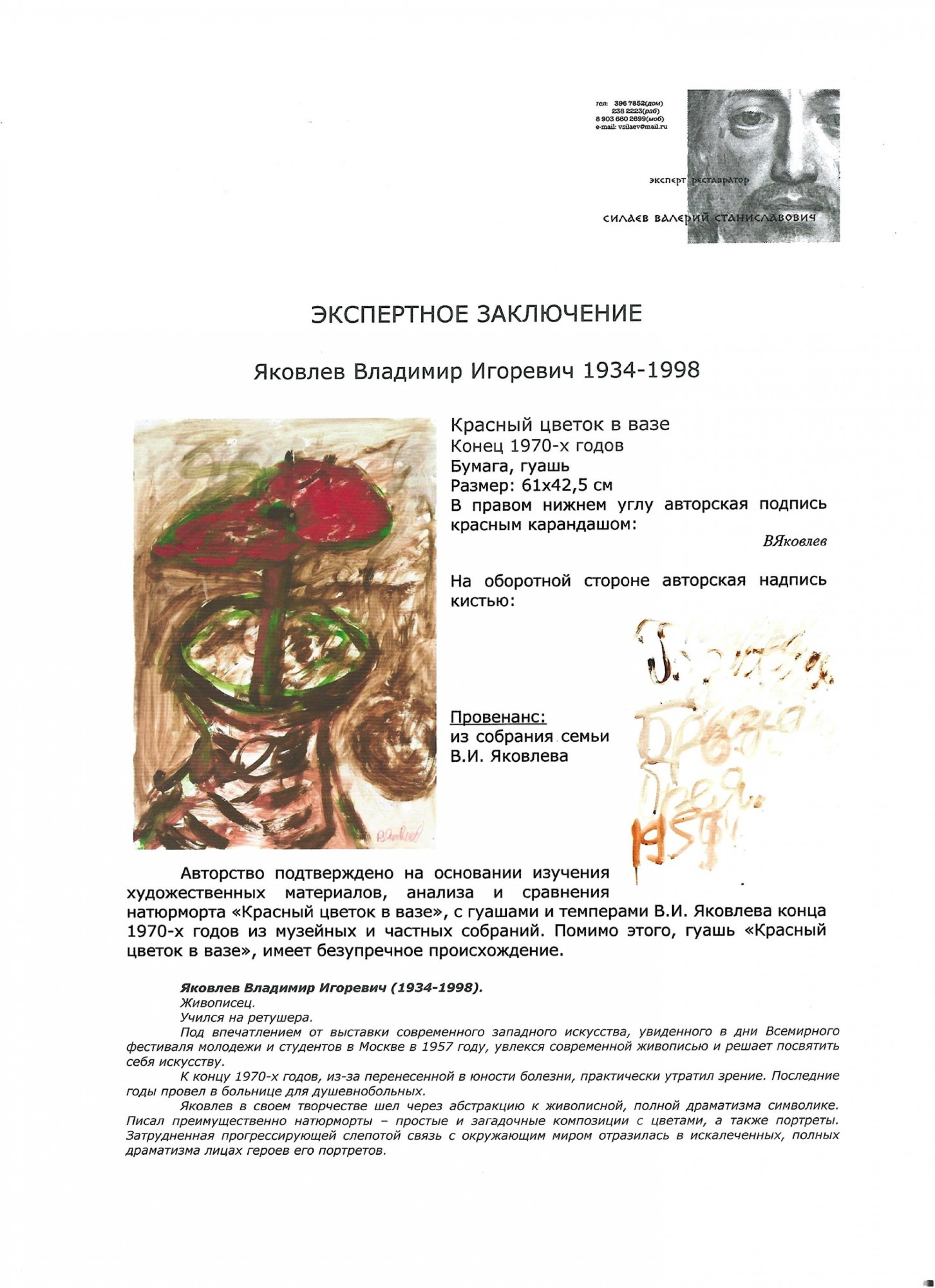 ЯКОВЛЕВ Владимир Игоревич (1934–1998) Красный цветок в вазе. 1970‑е ID лота: 113407
