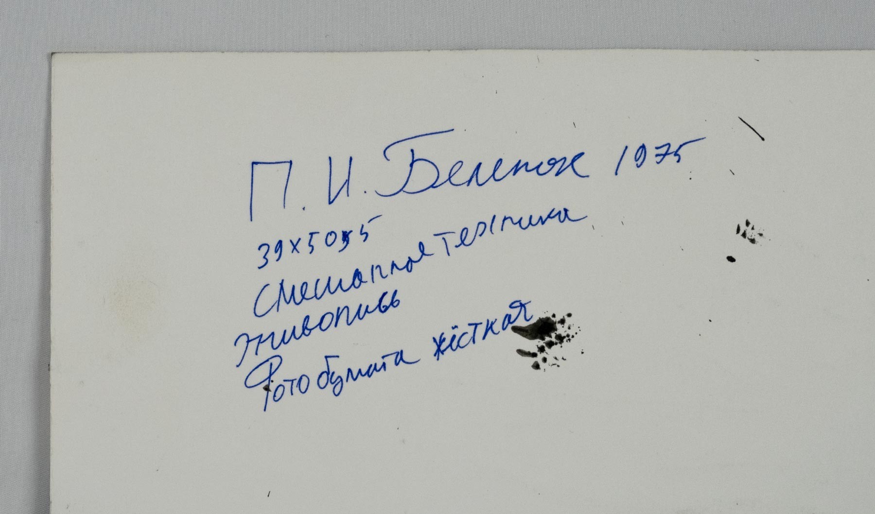 На обороте — владельческие надписи и штампы коллекций, а также благотворительный билет Советского Детского фонда им. В. И. Ленина с подписью Петра Беленка