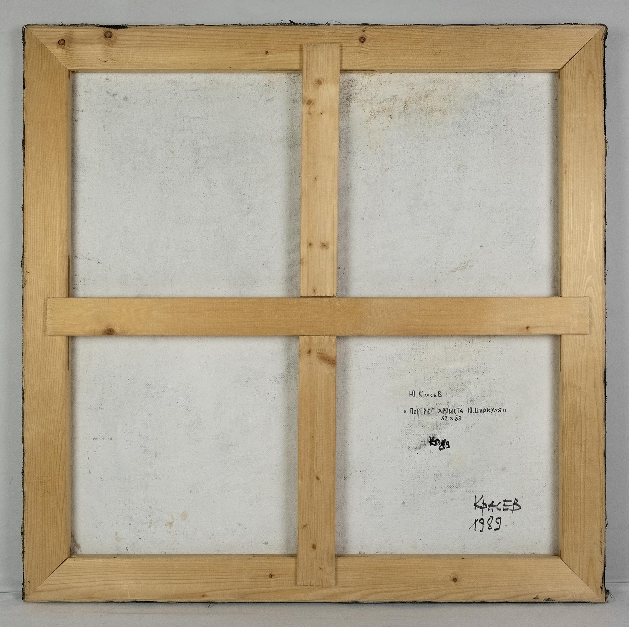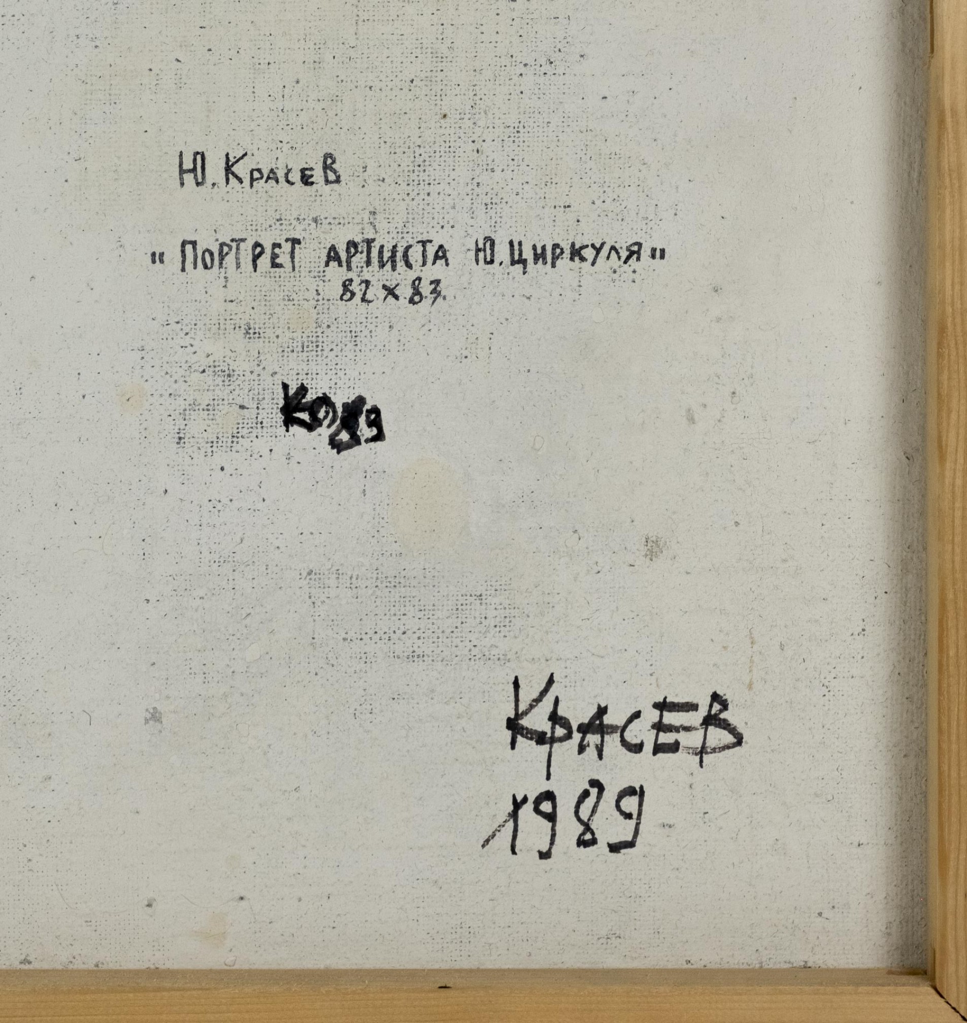 На обороте подпись, название и дата: Ю. Красев / «Портрет артиста Ю. Циркуля» / 82 × 83 / Красев / 1989