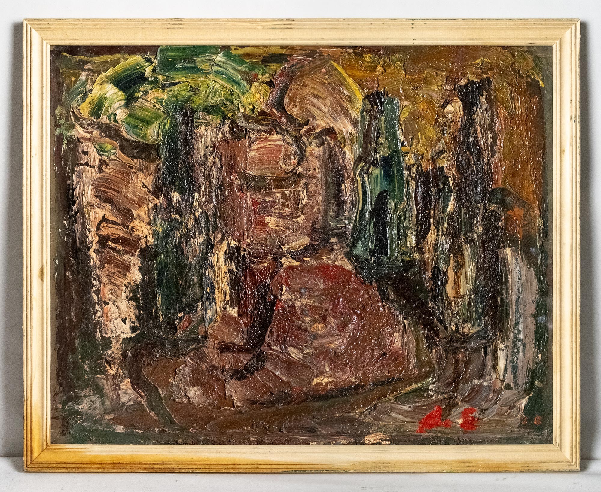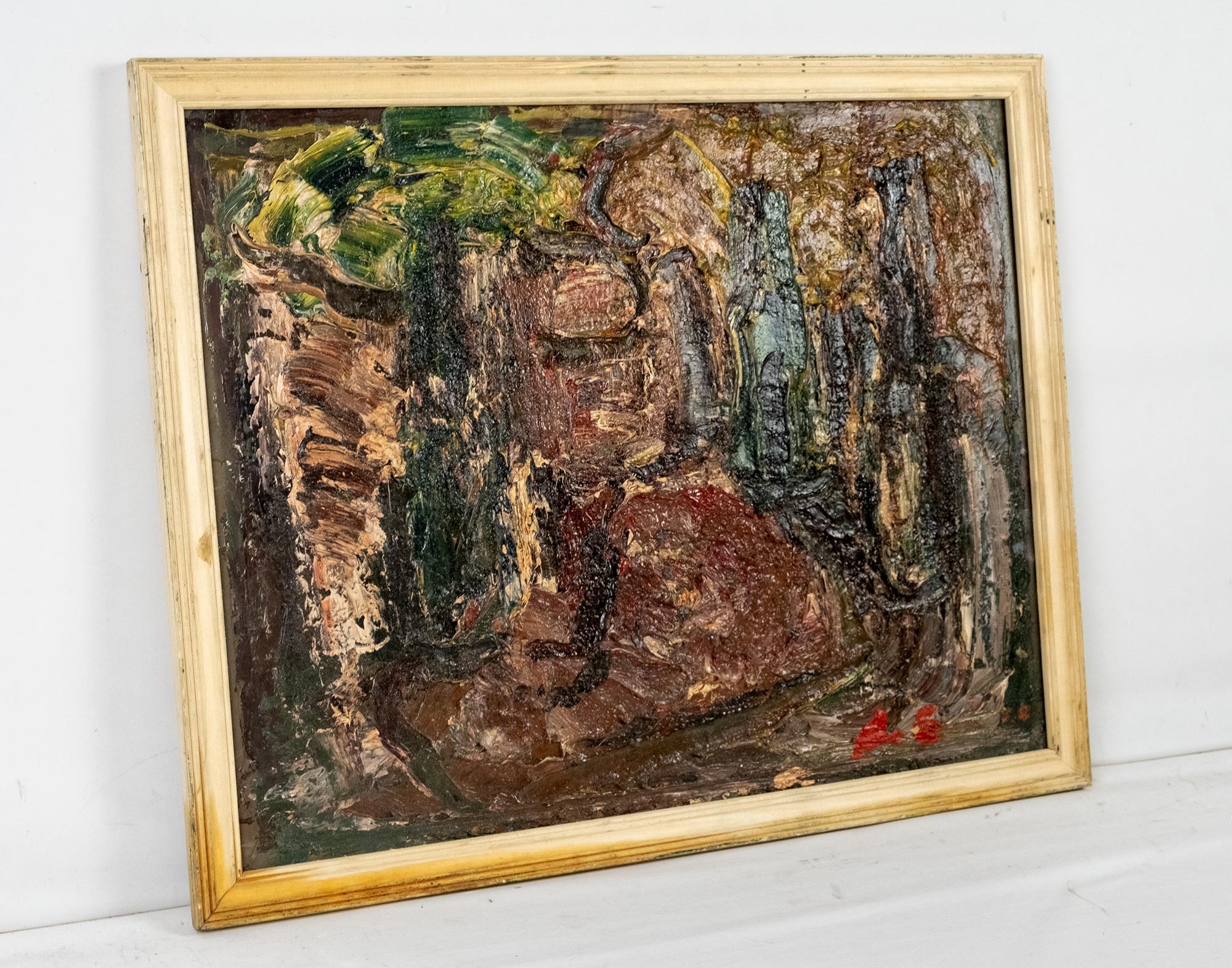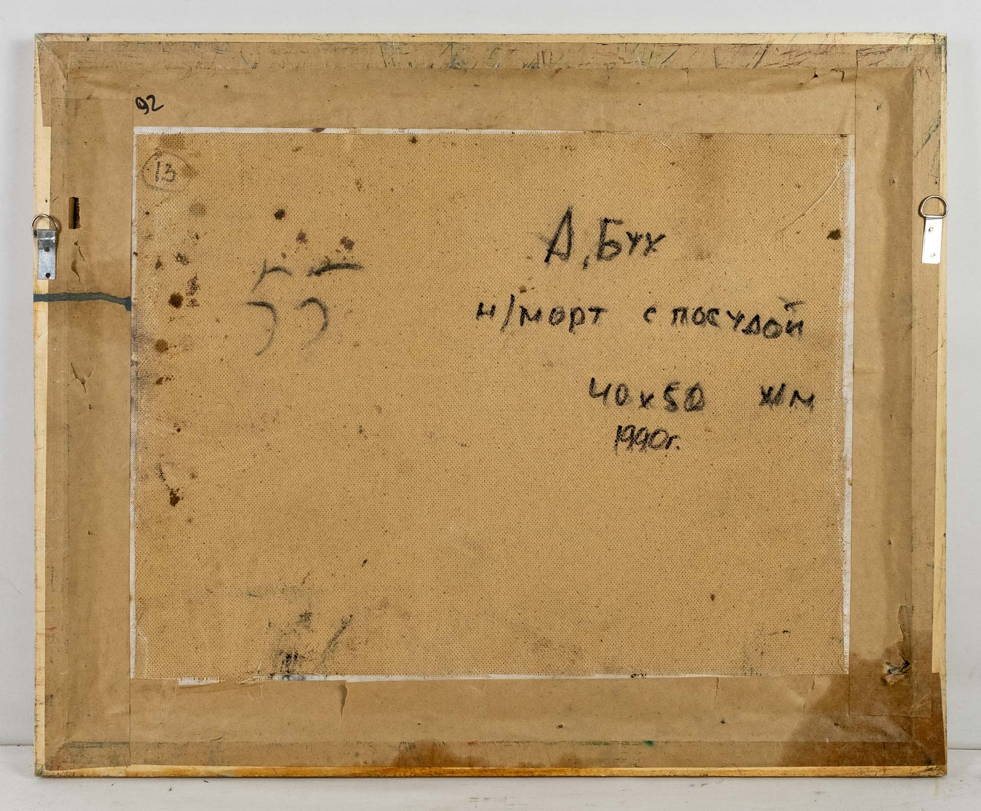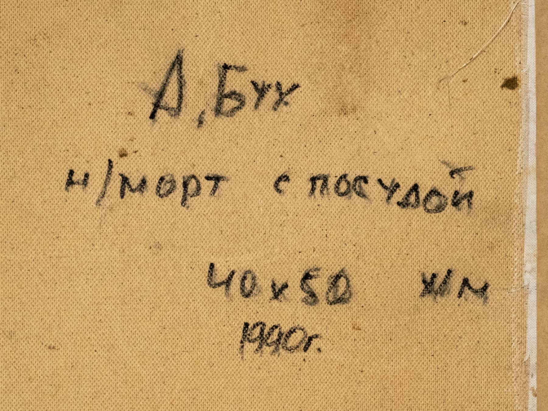 На обороте владельческая надпись: А. Бух / н/морт с посудой / 40 × 50 х/м / 1990 г.