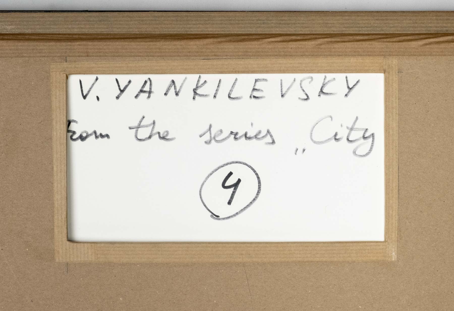 На обороте в правом верхнем углу подпись и название на английском языке: V. YANKILEVSKY / From the series “City” / 4
