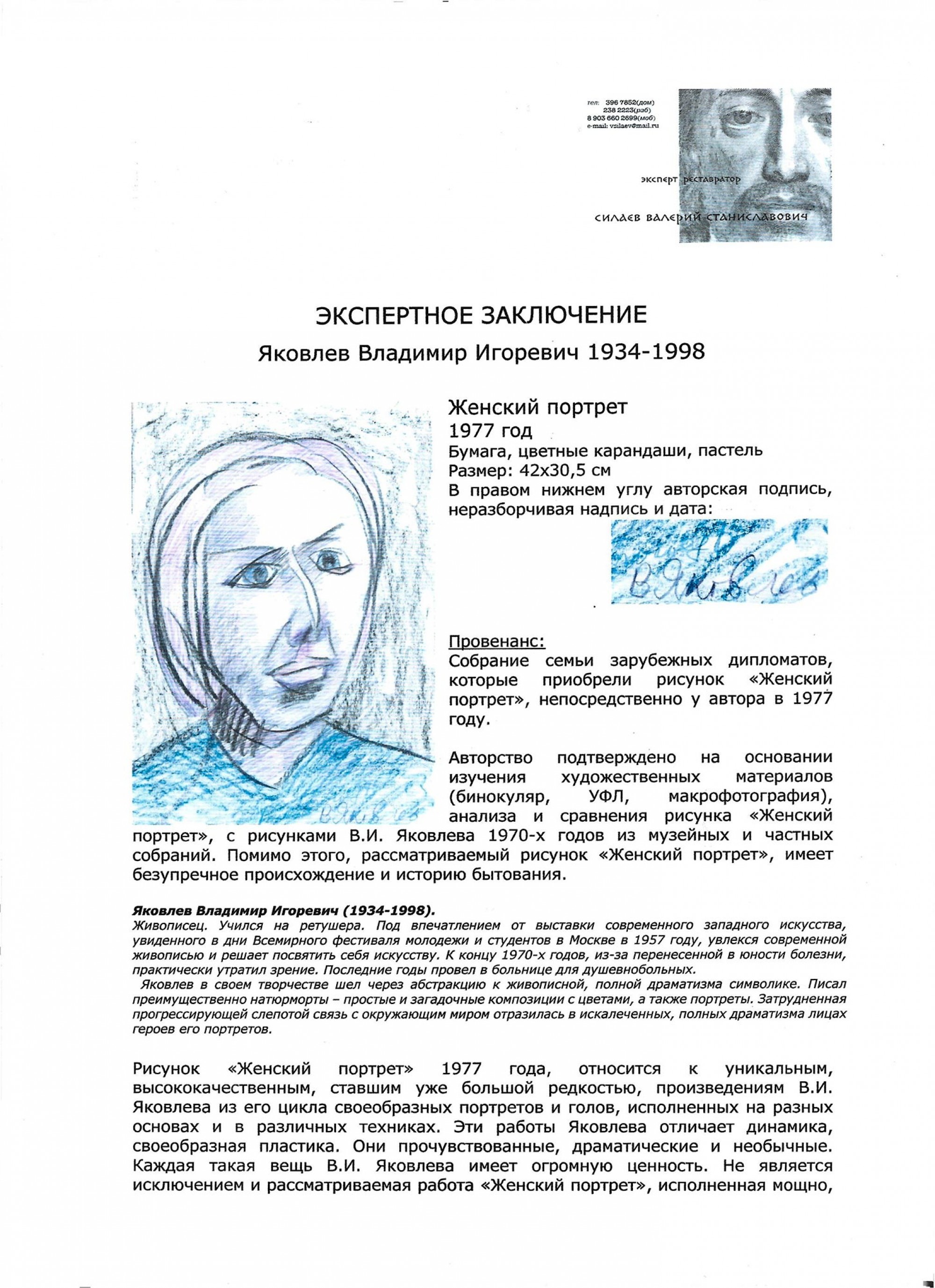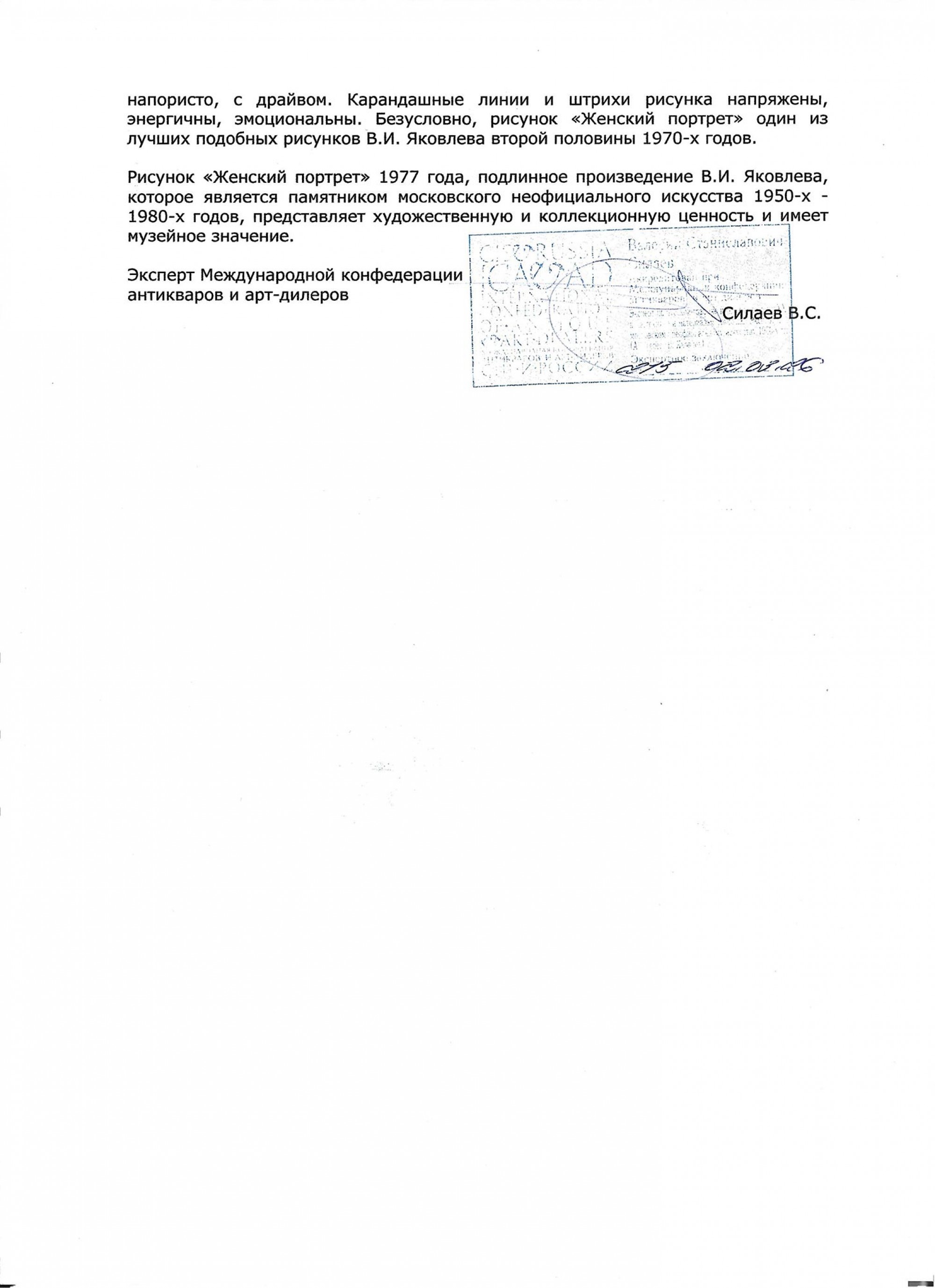 Провенанс: Собрание семьи зарубежных дипломатов, которые приобрели рисунок «Женский портрет», непосредственно у автора в 1977 году