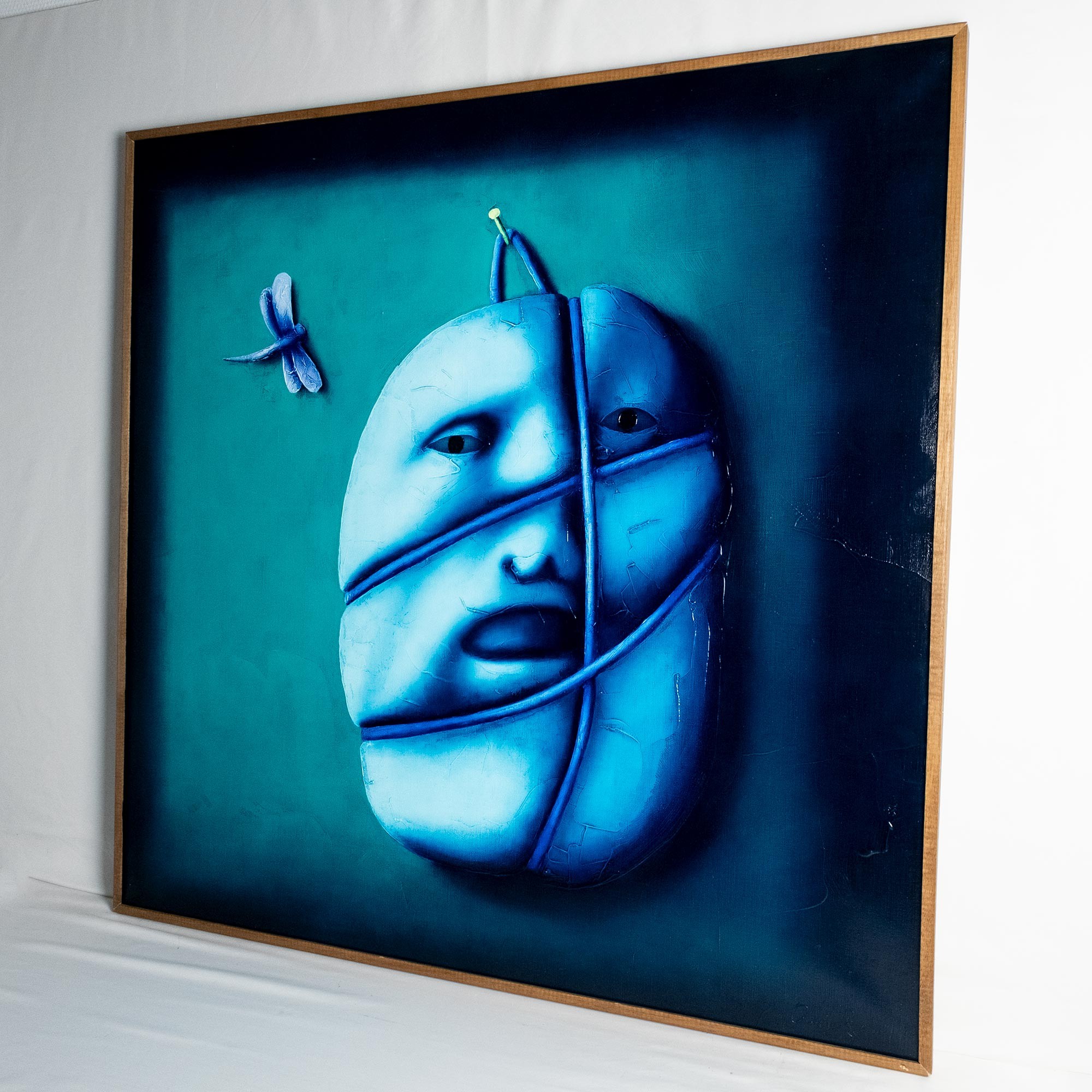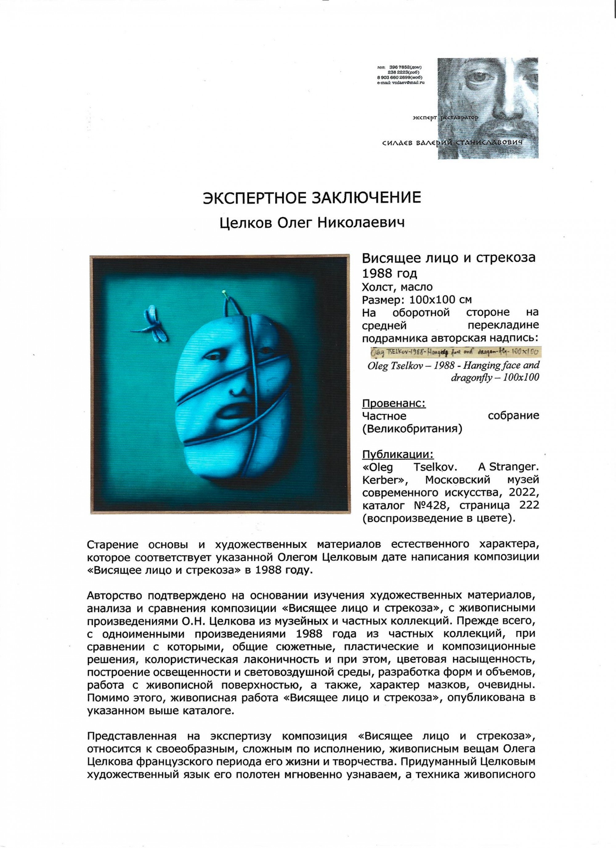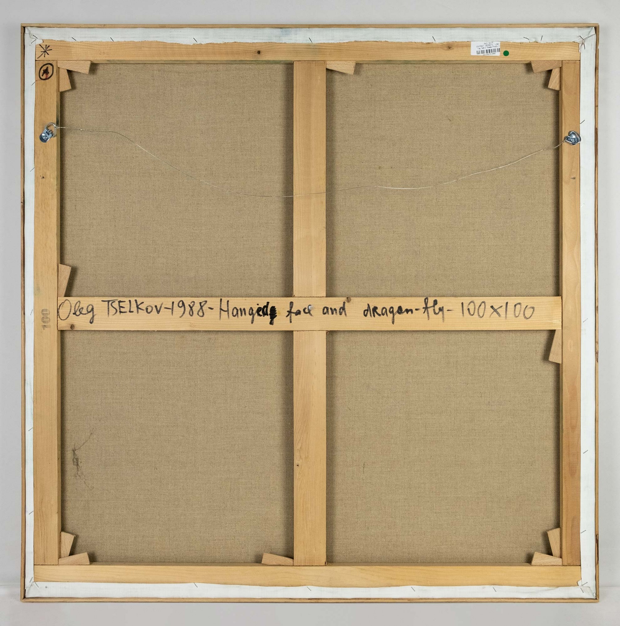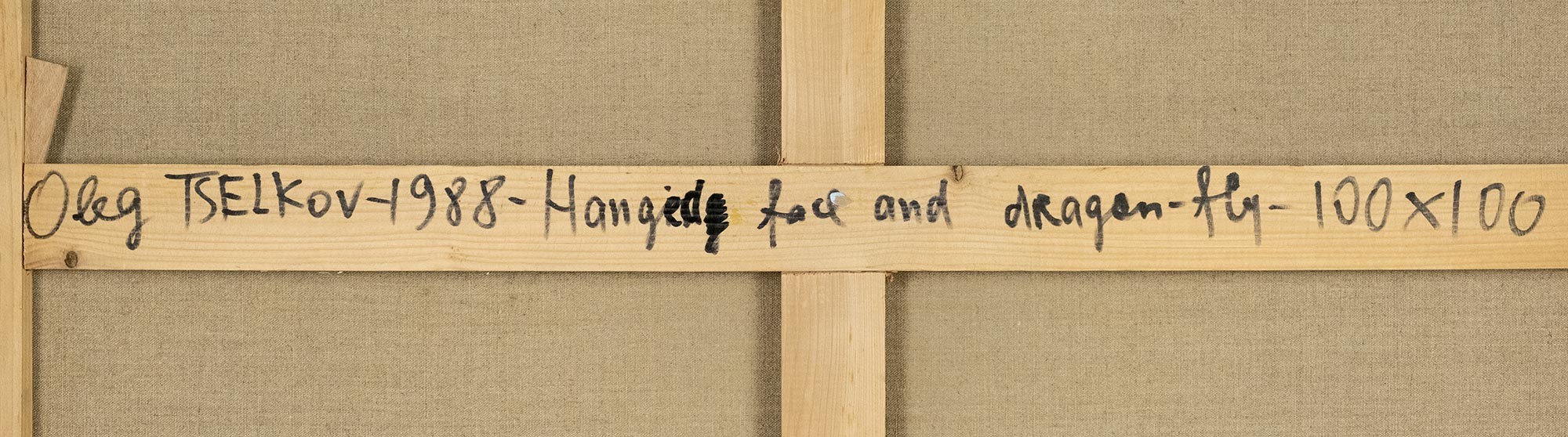 На обороте на подрамнике авторская надпись: Oleg TSELKOV — Hanged face and dragon‑fly — 100 × 100