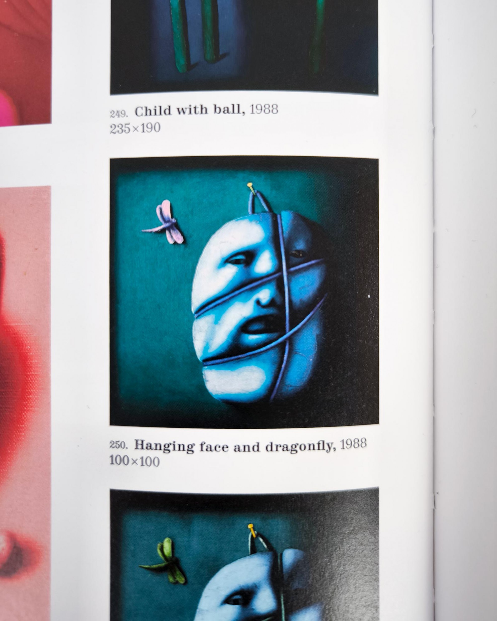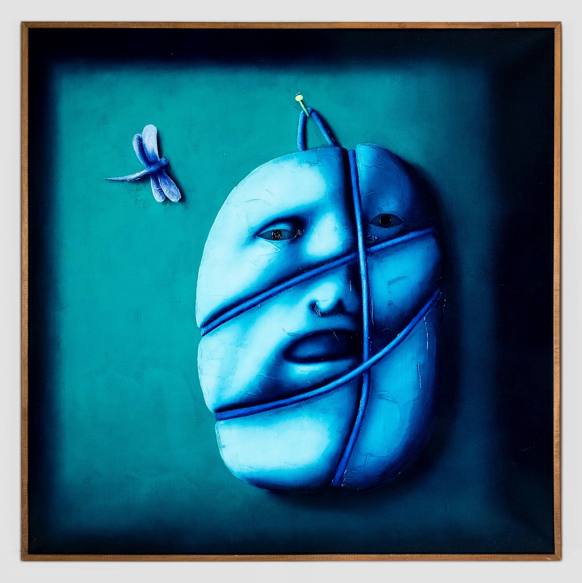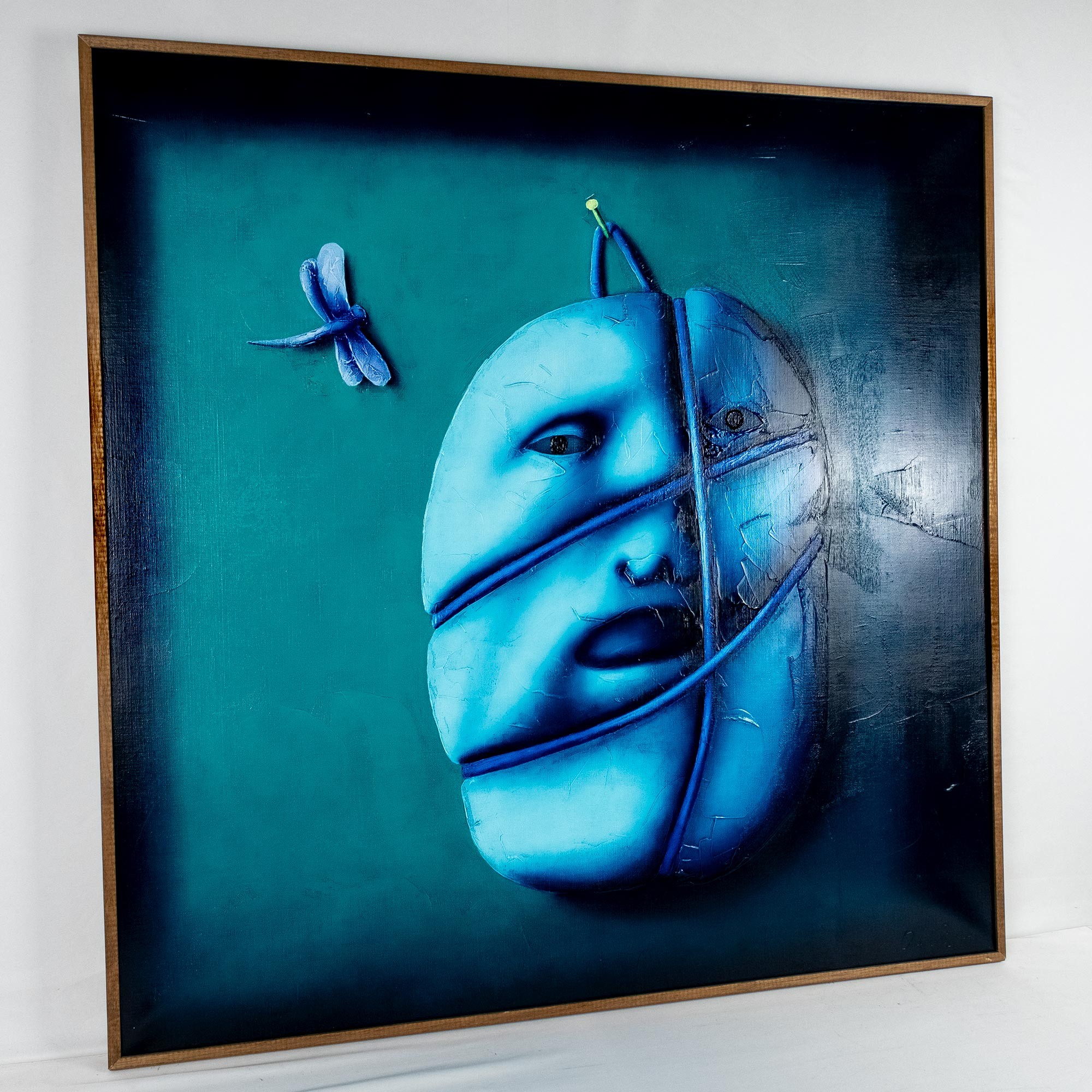 На обороте на подрамнике авторская надпись: Oleg TSELKOV — Hanged face and dragon‑fly — 100 × 100