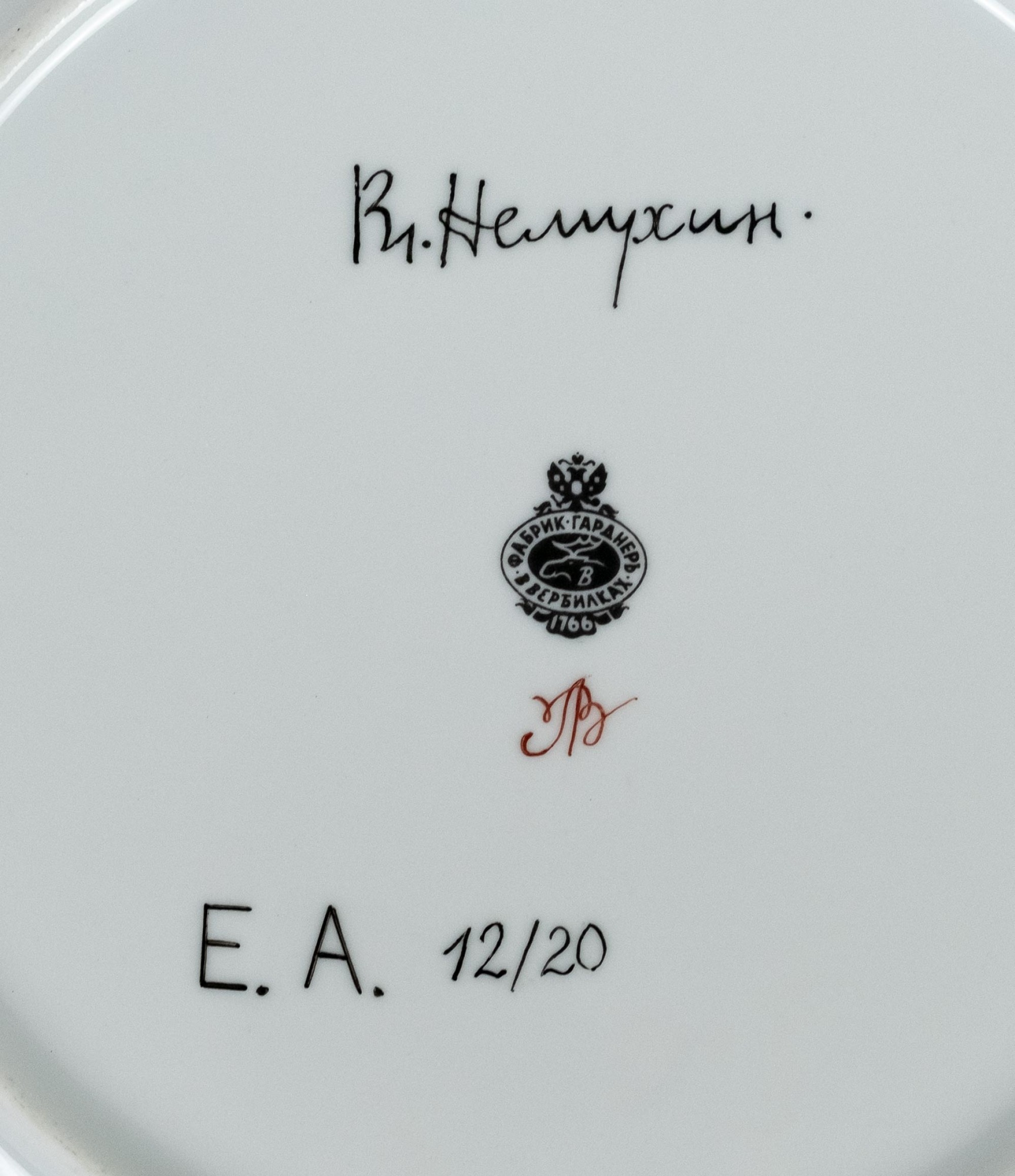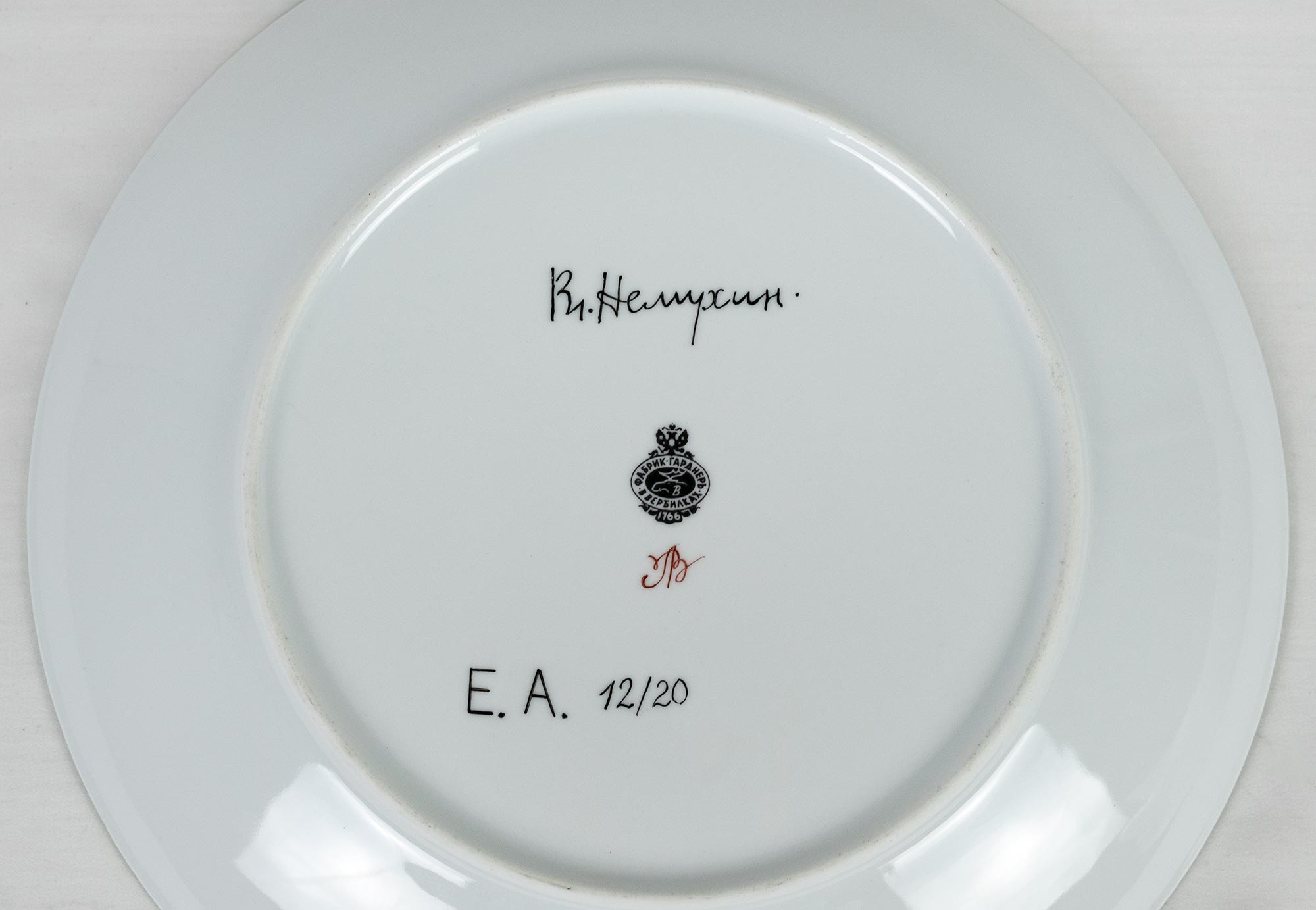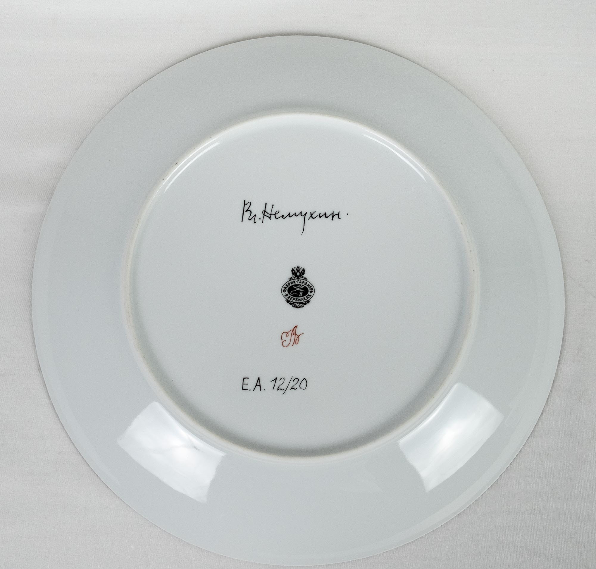 На обороте каждой тарелки — подпись Вл. Немухин, клеймо фабрики Гарднеръ в Вербилках и номер в тираже: E.A. 12/20