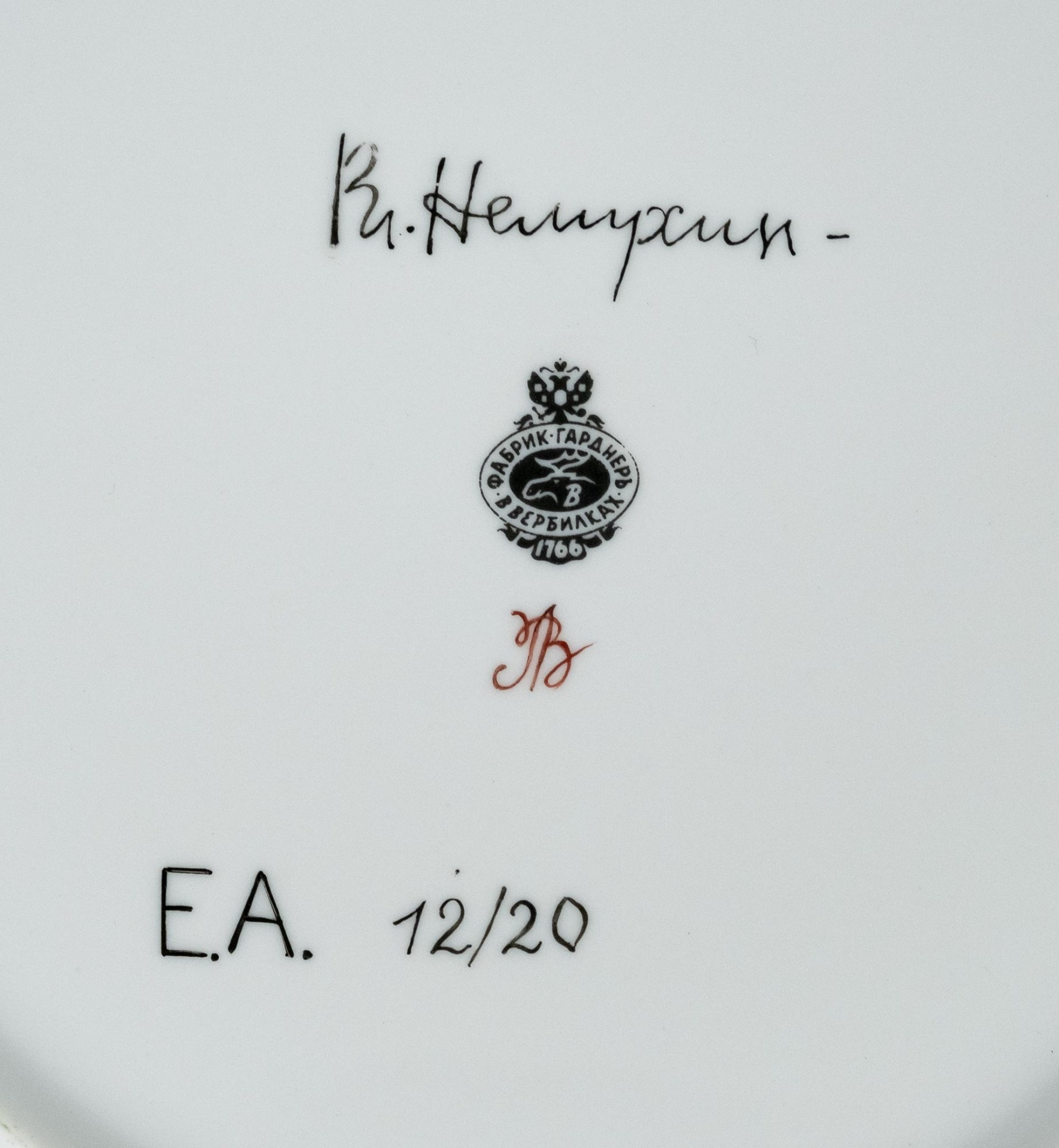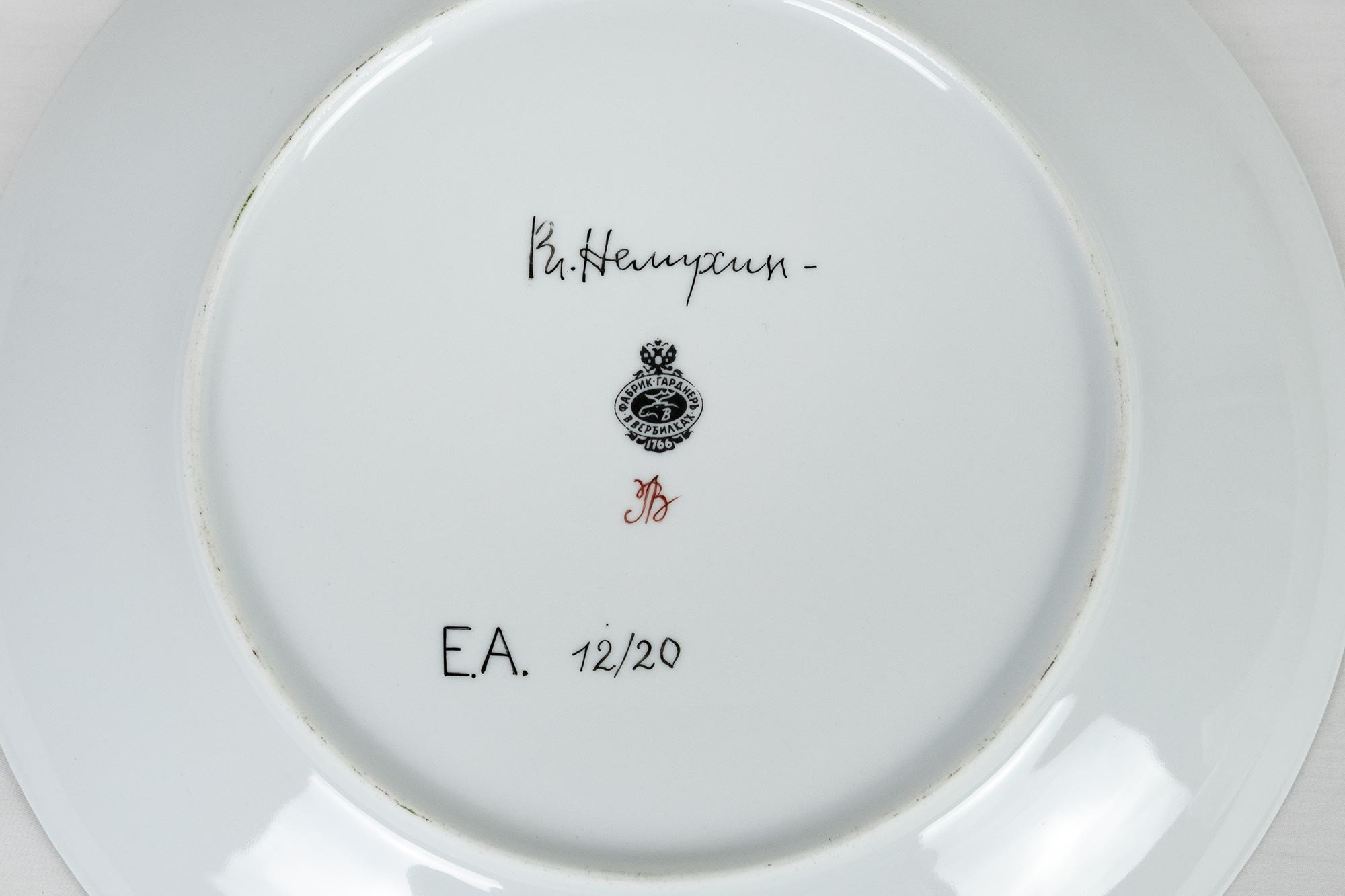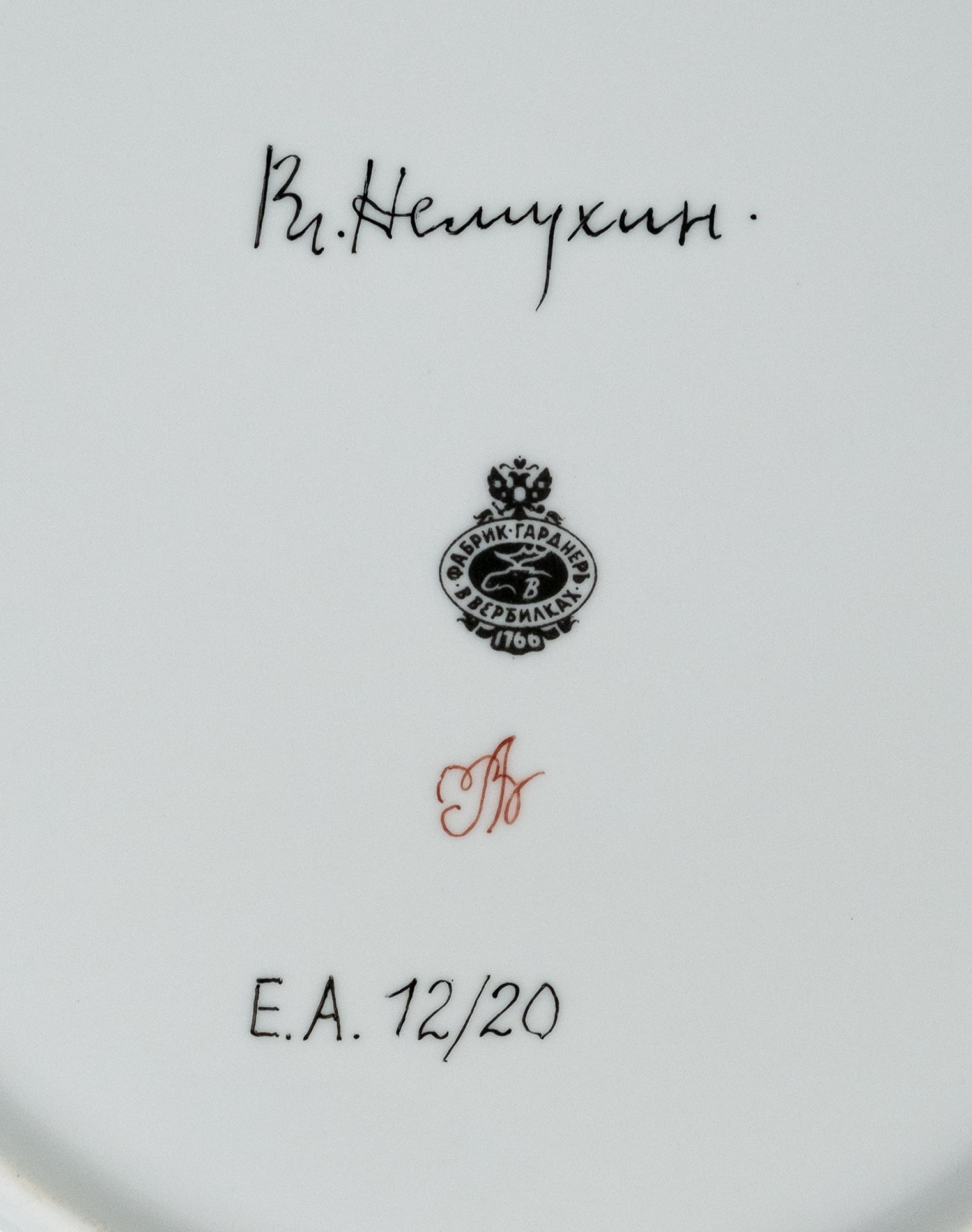 На обороте каждой тарелки — подпись Вл. Немухин, клеймо фабрики Гарднеръ в Вербилках и номер в тираже: E.A. 12/20