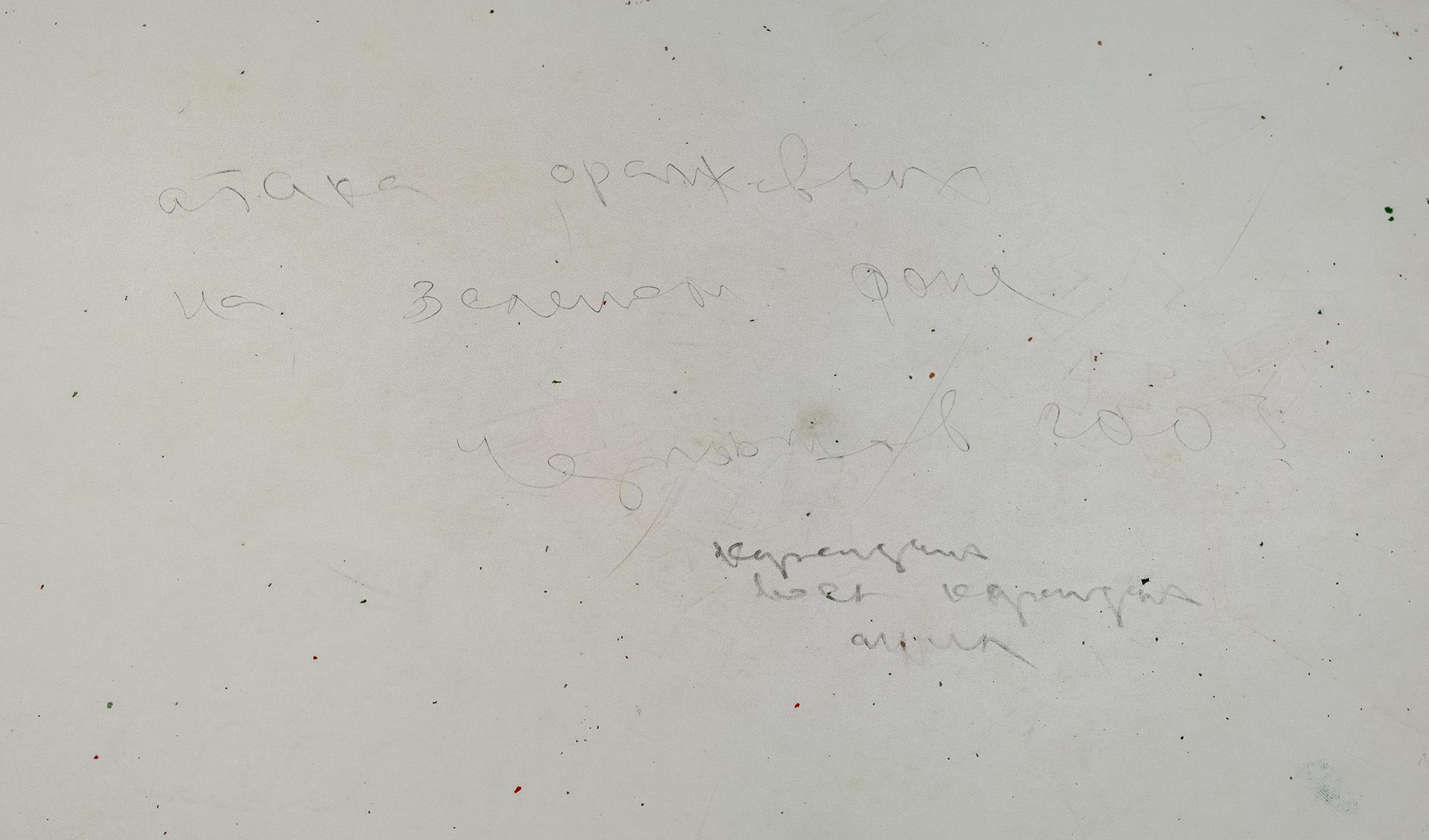 На обороте название, дата и техника: Атака оранжевых на зеленом фоне / Чернышов 2003 / Карандаш, воск. карандаш, акрил