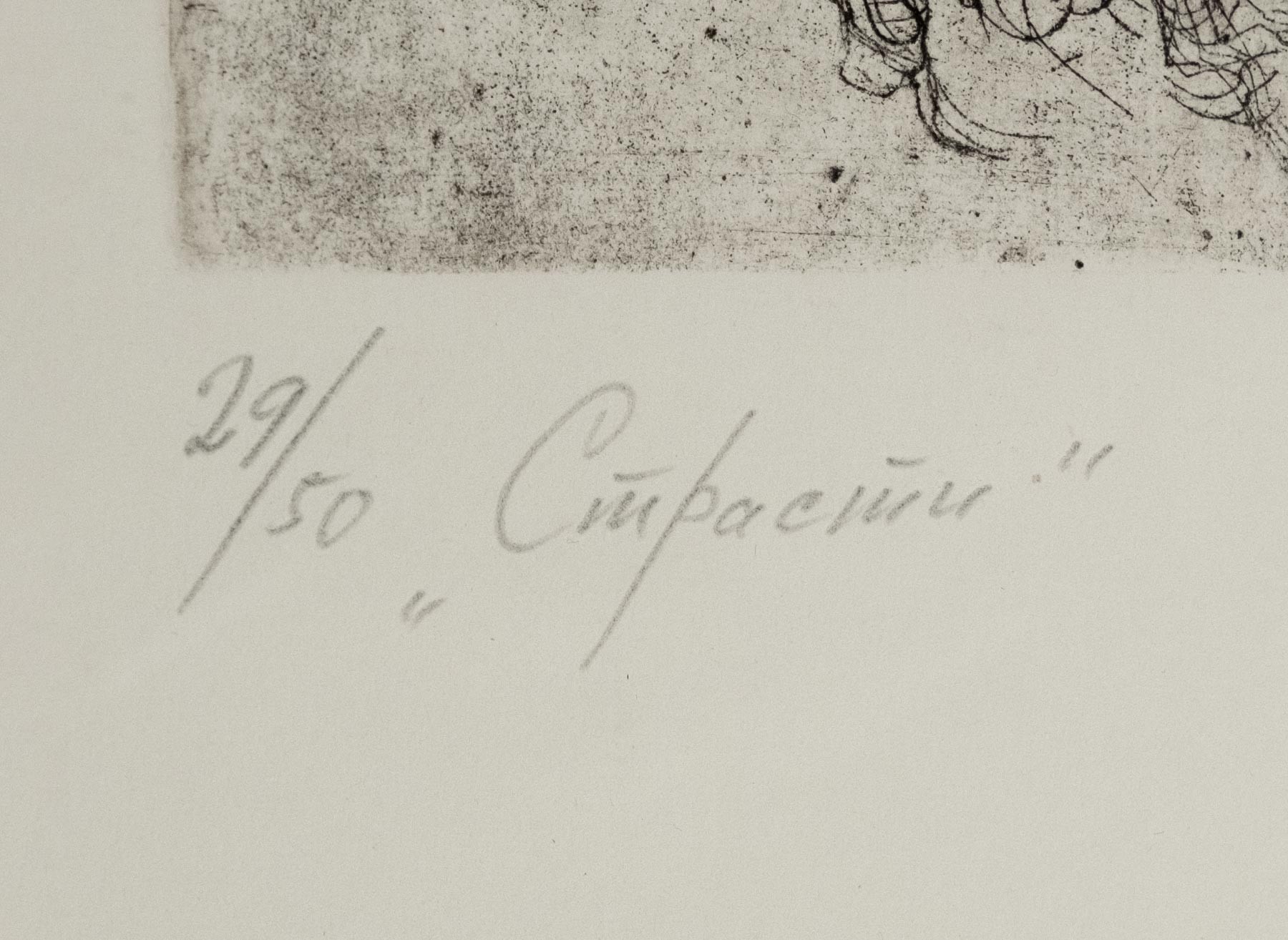 В левом нижнем углу тираж и название: 29/50 «Страсти»