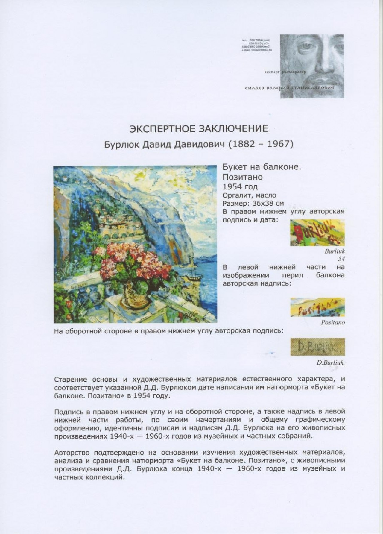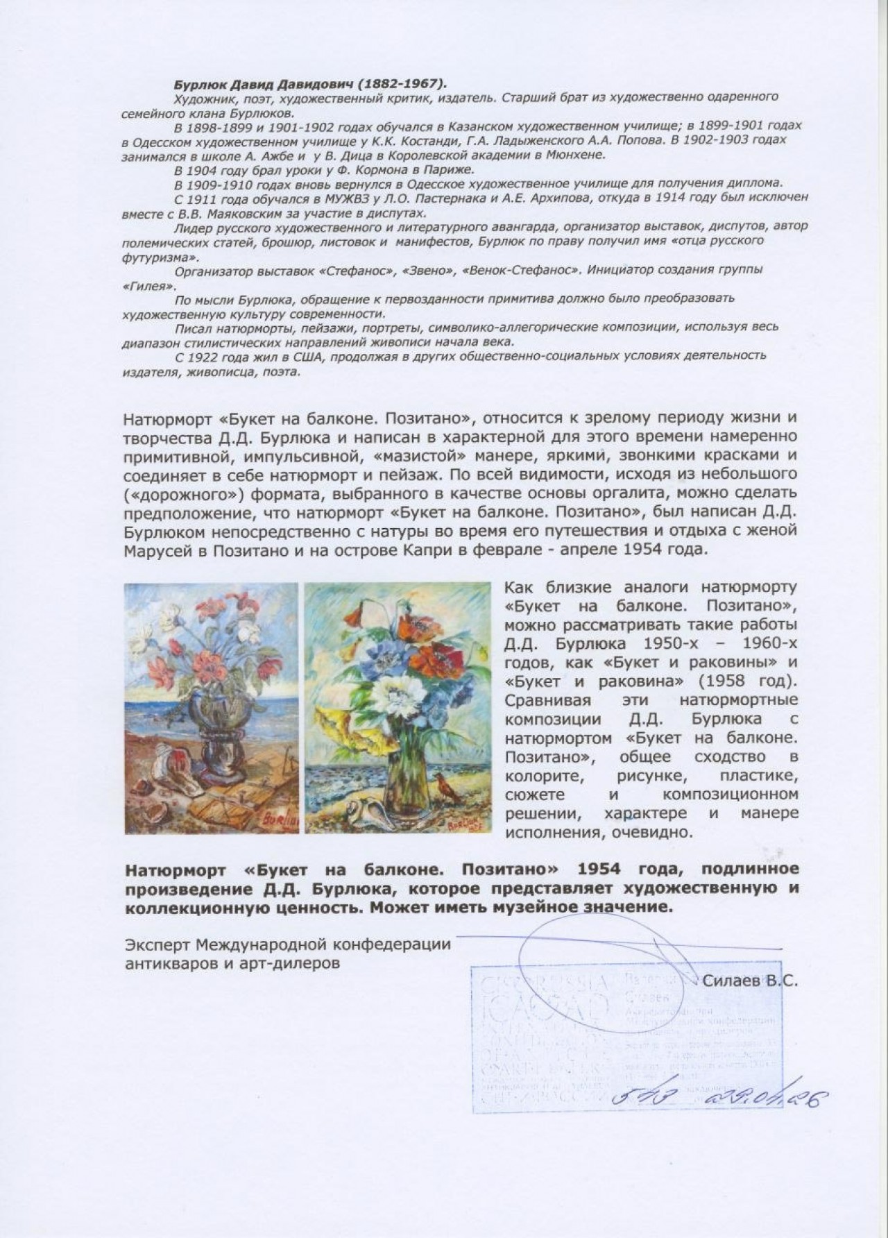 БУРЛЮК Давид Давидович (1882–1967) Букет на балконе. Позитано. 1954 ID лота: 113625