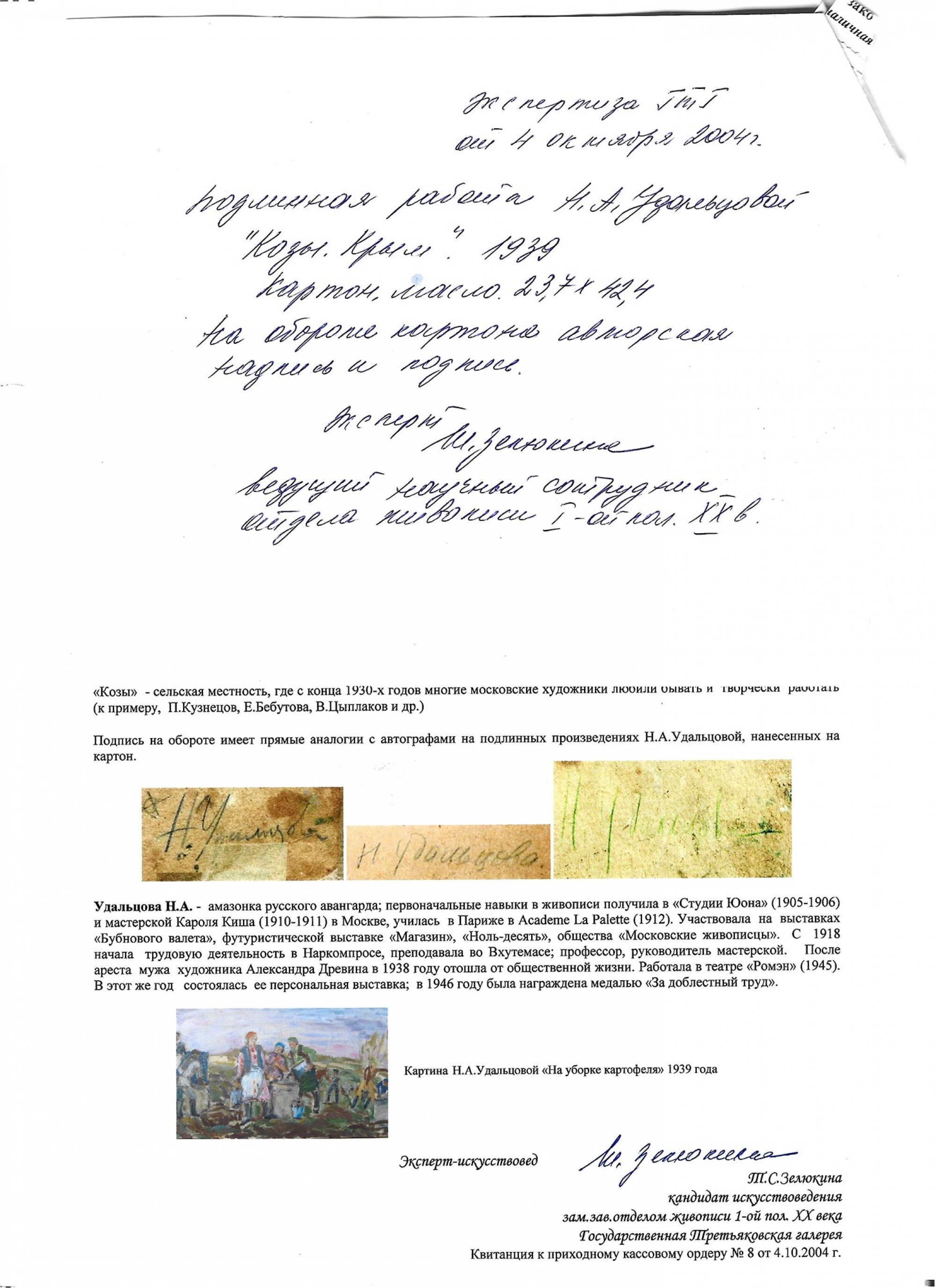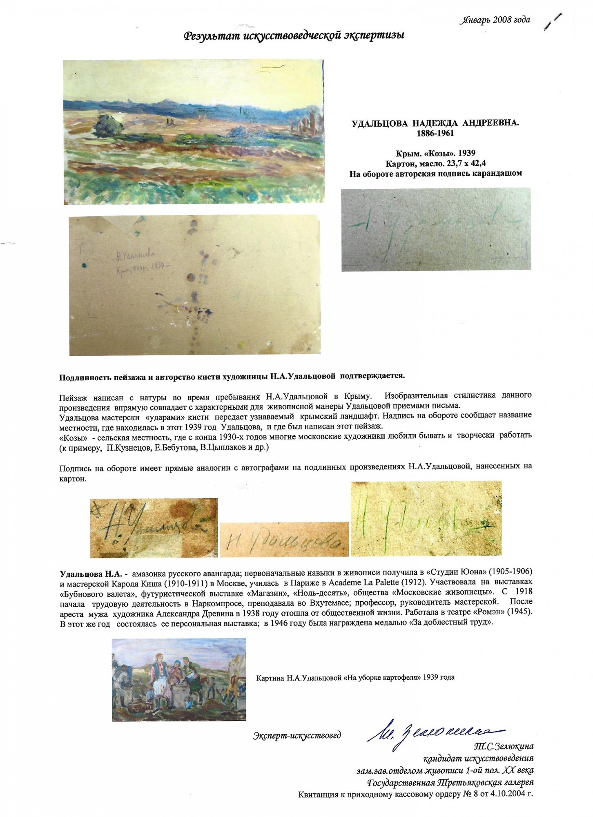 Экспертное заключение Татьяны Сергеевны Зелюкиной — составителя каталога «Александр Древин и Надежда Удальцова. Живопись из собрания Государственной Третьяковской галереи и частных коллекций. Каталог выставки» (Москва: Виртуальная галерея, 2008). Январь 2008 года