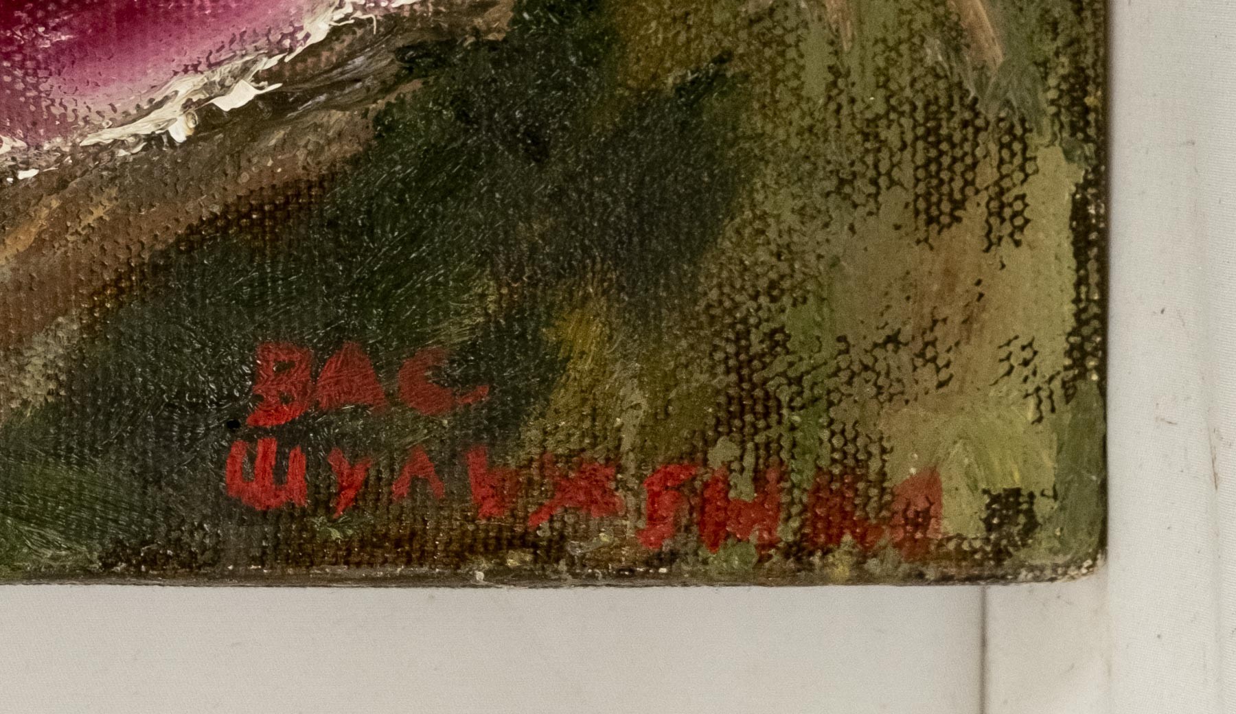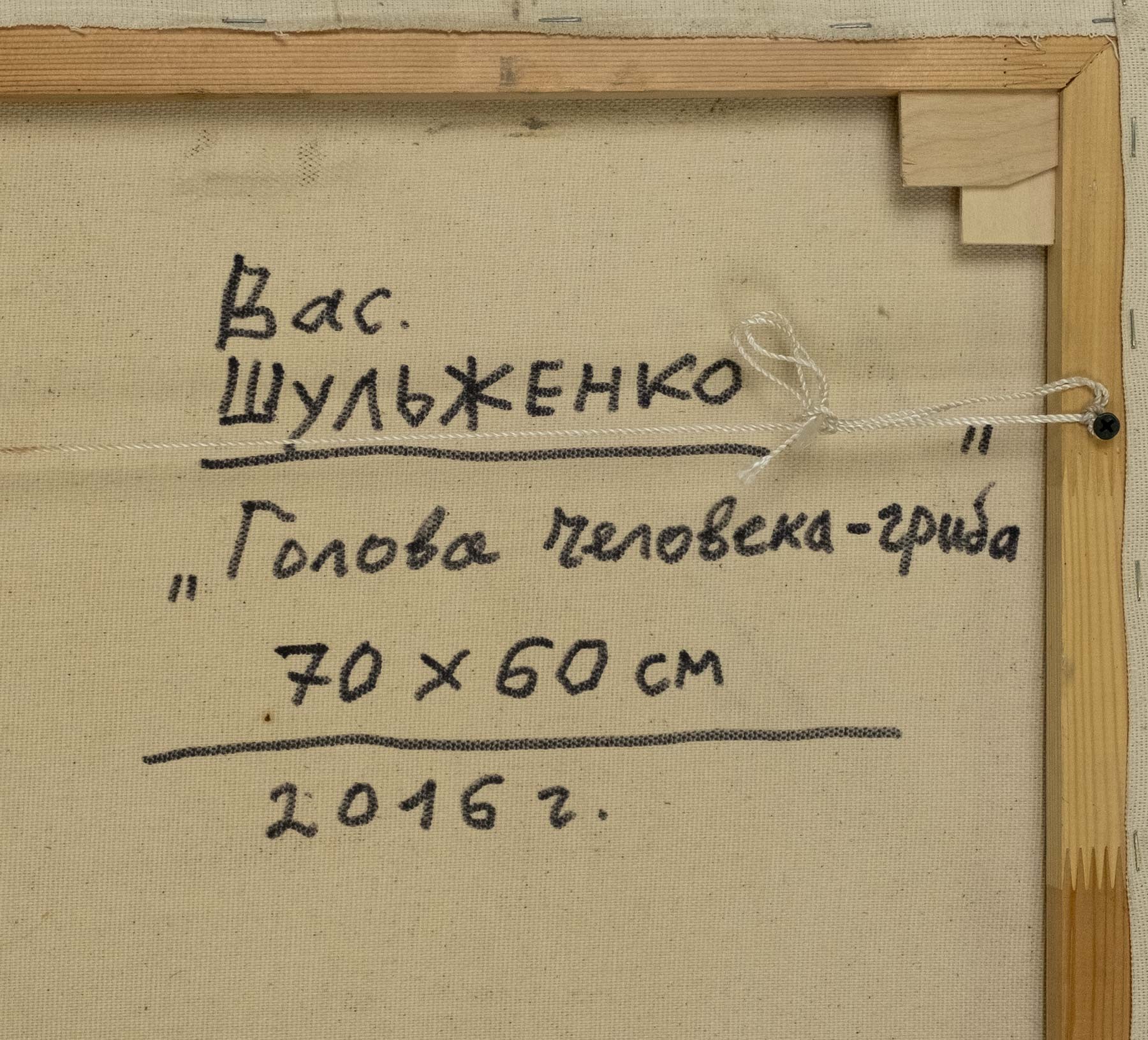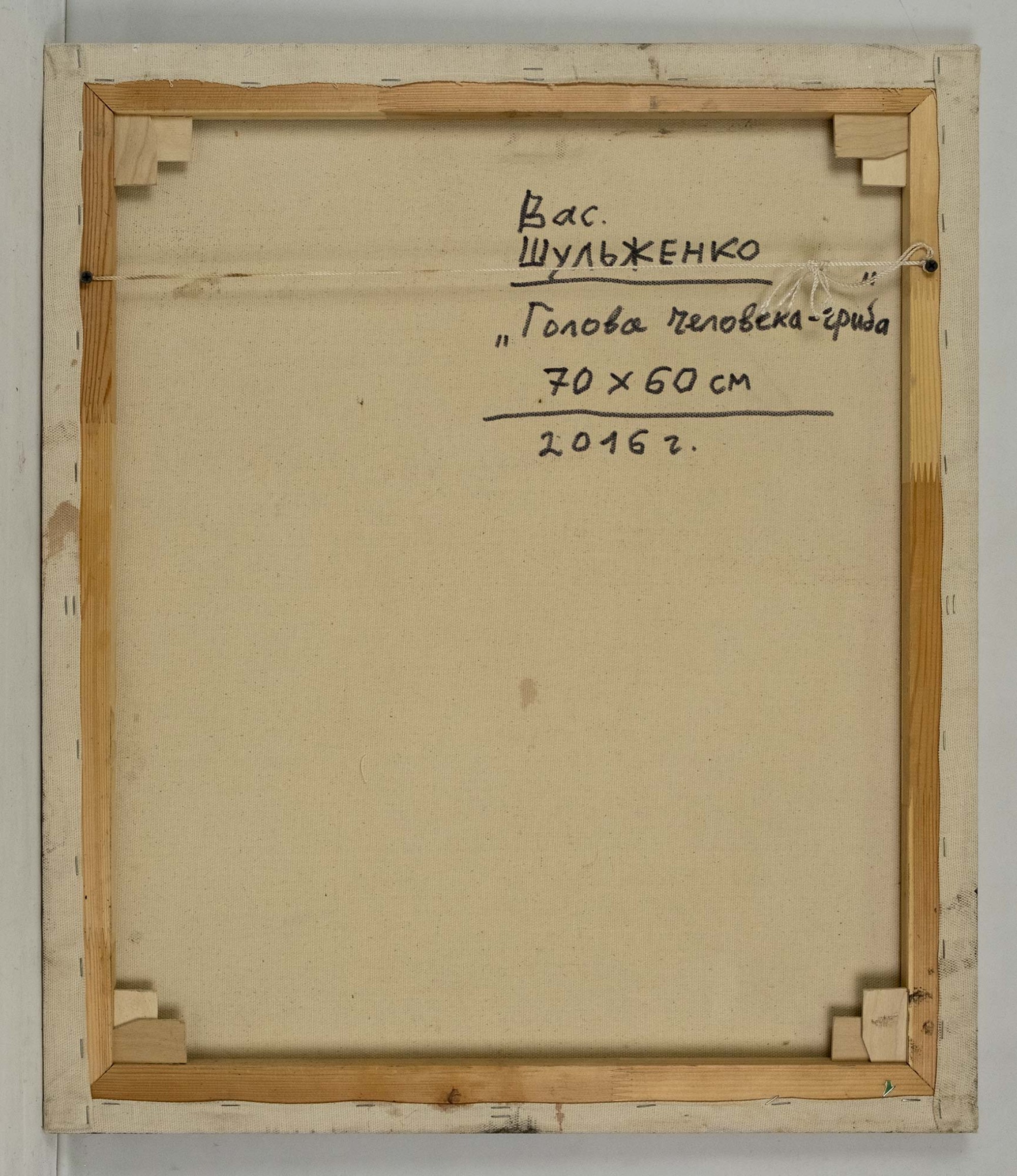 На обороте подпись, название, размер и дата: Вас. Шульженко / «Голова человека‑гриба» / 70 × 60 см / 2016 г.